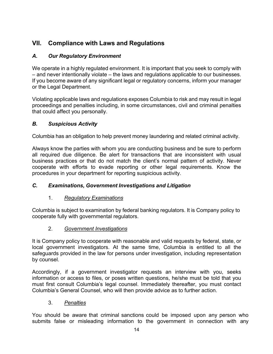 14 VII. Compliance with Laws and Regulations A. Our Regulatory Environment We operate in a highly regulated environment. It is important that you seek to comply with – and never intentionally violate – the laws and regulations applicable to our businesses. If you become aware of any significant legal or regulatory concerns, inform your manager or the Legal Department. Violating applicable laws and regulations exposes Columbia to risk and may result in legal proceedings and penalties including, in some circumstances, civil and criminal penalties that could affect you personally. B. Suspicious Activity Columbia has an obligation to help prevent money laundering and related criminal activity. Always know the parties with whom you are conducting business and be sure to perform all required due diligence. Be alert for transactions that are inconsistent with usual business practices or that do not match the client’s normal pattern of activity. Never cooperate with efforts to evade reporting or other legal requirements. Know the procedures in your department for reporting suspicious activity. C. Examinations, Government Investigations and Litigation 1. Regulatory Examinations Columbia is subject to examination by federal banking regulators. It is Company policy to cooperate fully with governmental regulators. 2. Government Investigations It is Company policy to cooperate with reasonable and valid requests by federal, state, or local government investigators. At the same time, Columbia is entitled to all the safeguards provided in the law for persons under investigation, including representation by counsel. Accordingly, if a government investigator requests an interview with you, seeks information or access to files, or poses written questions, he/she must be told that you must first consult Columbia’s legal counsel. Immediately thereafter, you must contact Columbia’s General Counsel, who will then provide advice as to further action. 3. Penalties You should be aware that criminal sanctions could be imposed upon any person who submits false or misleading information to the government in connection with any