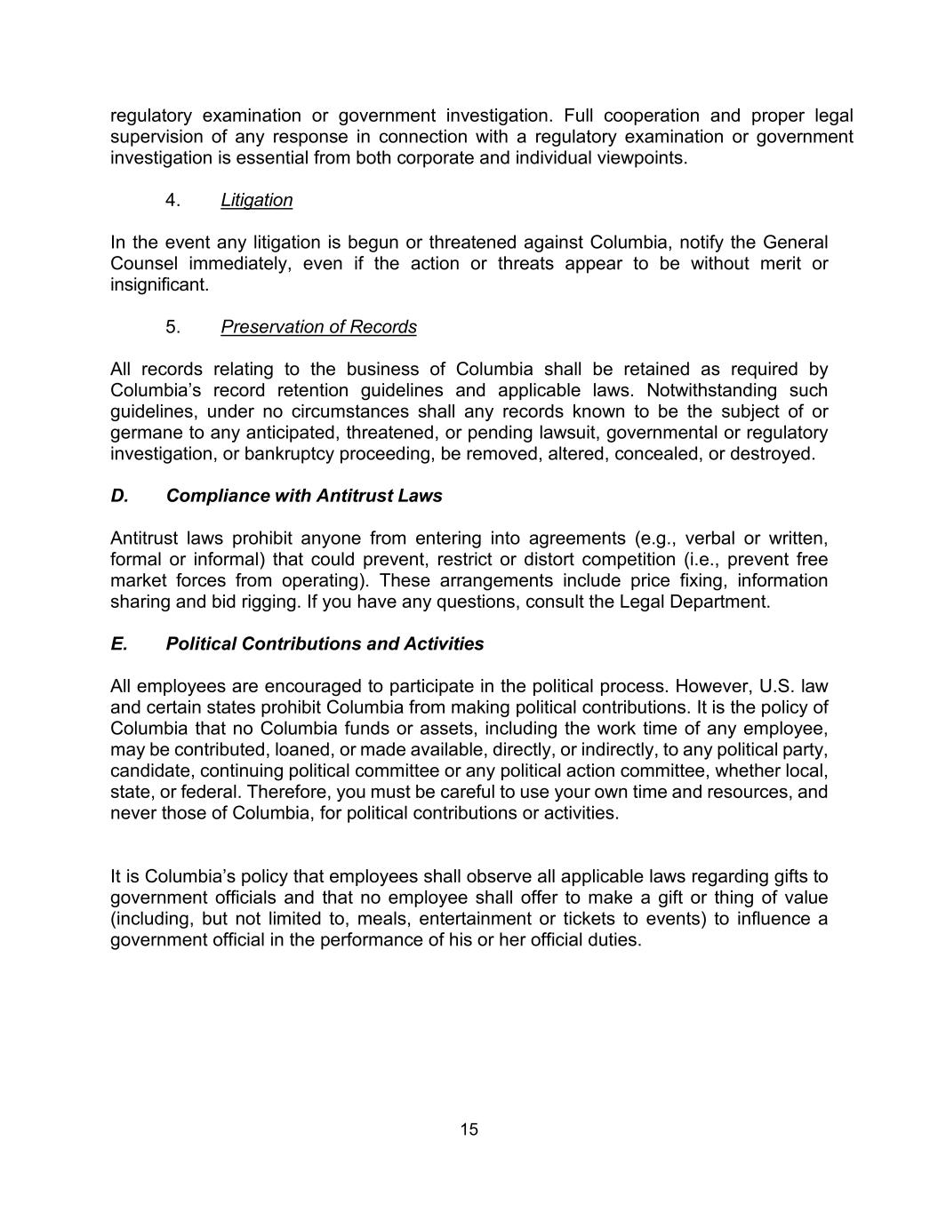 15 regulatory examination or government investigation. Full cooperation and proper legal supervision of any response in connection with a regulatory examination or government investigation is essential from both corporate and individual viewpoints. 4. Litigation In the event any litigation is begun or threatened against Columbia, notify the General Counsel immediately, even if the action or threats appear to be without merit or insignificant. 5. Preservation of Records All records relating to the business of Columbia shall be retained as required by Columbia’s record retention guidelines and applicable laws. Notwithstanding such guidelines, under no circumstances shall any records known to be the subject of or germane to any anticipated, threatened, or pending lawsuit, governmental or regulatory investigation, or bankruptcy proceeding, be removed, altered, concealed, or destroyed. D. Compliance with Antitrust Laws Antitrust laws prohibit anyone from entering into agreements (e.g., verbal or written, formal or informal) that could prevent, restrict or distort competition (i.e., prevent free market forces from operating). These arrangements include price fixing, information sharing and bid rigging. If you have any questions, consult the Legal Department. E. Political Contributions and Activities All employees are encouraged to participate in the political process. However, U.S. law and certain states prohibit Columbia from making political contributions. It is the policy of Columbia that no Columbia funds or assets, including the work time of any employee, may be contributed, loaned, or made available, directly, or indirectly, to any political party, candidate, continuing political committee or any political action committee, whether local, state, or federal. Therefore, you must be careful to use your own time and resources, and never those of Columbia, for political contributions or activities. It is Columbia’s policy that employees shall observe all applicable laws regarding gifts to government officials and that no employee shall offer to make a gift or thing of value (including, but not limited to, meals, entertainment or tickets to events) to influence a government official in the performance of his or her official duties.