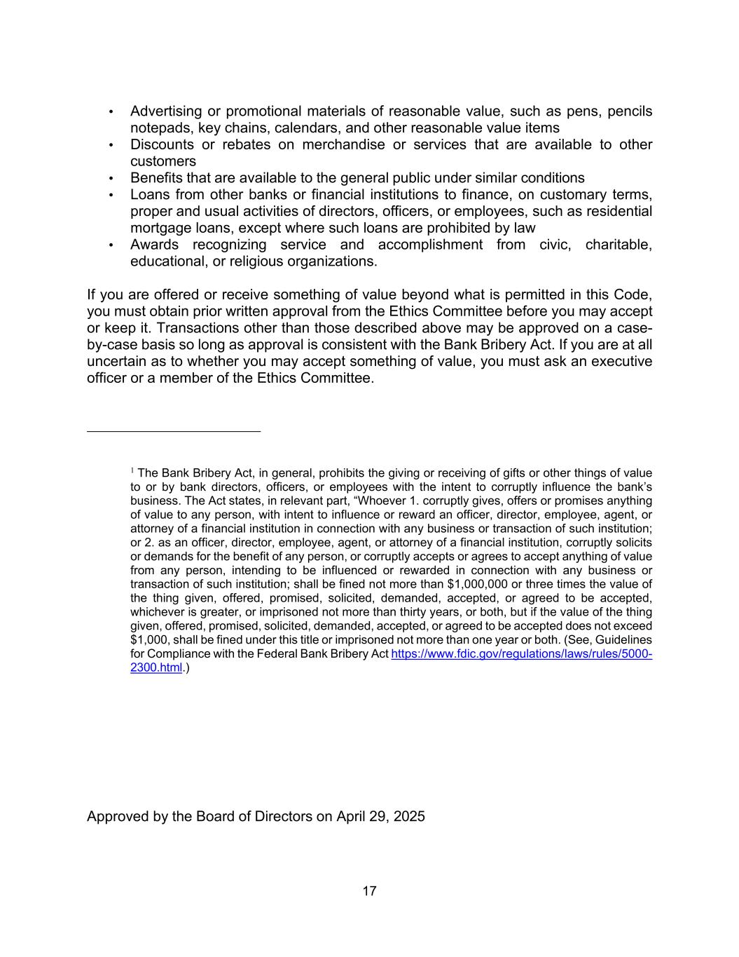 17 • Advertising or promotional materials of reasonable value, such as pens, pencils notepads, key chains, calendars, and other reasonable value items • Discounts or rebates on merchandise or services that are available to other customers • Benefits that are available to the general public under similar conditions • Loans from other banks or financial institutions to finance, on customary terms, proper and usual activities of directors, officers, or employees, such as residential mortgage loans, except where such loans are prohibited by law • Awards recognizing service and accomplishment from civic, charitable, educational, or religious organizations. If you are offered or receive something of value beyond what is permitted in this Code, you must obtain prior written approval from the Ethics Committee before you may accept or keep it. Transactions other than those described above may be approved on a case- by-case basis so long as approval is consistent with the Bank Bribery Act. If you are at all uncertain as to whether you may accept something of value, you must ask an executive officer or a member of the Ethics Committee. 1 The Bank Bribery Act, in general, prohibits the giving or receiving of gifts or other things of value to or by bank directors, officers, or employees with the intent to corruptly influence the bank’s business. The Act states, in relevant part, “Whoever 1. corruptly gives, offers or promises anything of value to any person, with intent to influence or reward an officer, director, employee, agent, or attorney of a financial institution in connection with any business or transaction of such institution; or 2. as an officer, director, employee, agent, or attorney of a financial institution, corruptly solicits or demands for the benefit of any person, or corruptly accepts or agrees to accept anything of value from any person, intending to be influenced or rewarded in connection with any business or transaction of such institution; shall be fined not more than $1,000,000 or three times the value of the thing given, offered, promised, solicited, demanded, accepted, or agreed to be accepted, whichever is greater, or imprisoned not more than thirty years, or both, but if the value of the thing given, offered, promised, solicited, demanded, accepted, or agreed to be accepted does not exceed $1,000, shall be fined under this title or imprisoned not more than one year or both. (See, Guidelines for Compliance with the Federal Bank Bribery Act https://www.fdic.gov/regulations/laws/rules/5000- 2300.html.) Approved by the Board of Directors on April 29, 2025