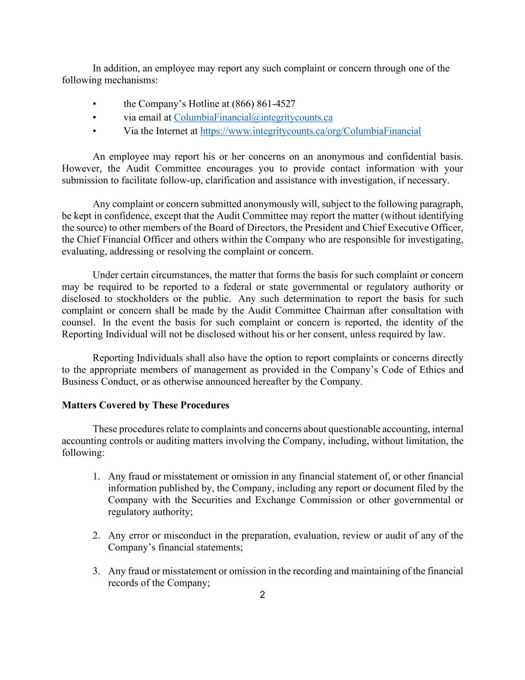 2 In addition, an employee may report any such complaint or concern through one of the following mechanisms: • the Company’s Hotline at (866) 861-4527 • via email at ColumbiaFinancial@integritycounts.ca • Via the Internet at https://www.integritycounts.ca/org/ColumbiaFinancial An employee may report his or her concerns on an anonymous and confidential basis. However, the Audit Committee encourages you to provide contact information with your submission to facilitate follow-up, clarification and assistance with investigation, if necessary. Any complaint or concern submitted anonymously will, subject to the following paragraph, be kept in confidence, except that the Audit Committee may report the matter (without identifying the source) to other members of the Board of Directors, the President and Chief Executive Officer, the Chief Financial Officer and others within the Company who are responsible for investigating, evaluating, addressing or resolving the complaint or concern. Under certain circumstances, the matter that forms the basis for such complaint or concern may be required to be reported to a federal or state governmental or regulatory authority or disclosed to stockholders or the public. Any such determination to report the basis for such complaint or concern shall be made by the Audit Committee Chairman after consultation with counsel. In the event the basis for such complaint or concern is reported, the identity of the Reporting Individual will not be disclosed without his or her consent, unless required by law. Reporting Individuals shall also have the option to report complaints or concerns directly to the appropriate members of management as provided in the Company’s Code of Ethics and Business Conduct, or as otherwise announced hereafter by the Company. Matters Covered by These Procedures These procedures relate to complaints and concerns about questionable accounting, internal accounting controls or auditing matters involving the Company, including, without limitation, the following: 1. Any fraud or misstatement or omission in any financial statement of, or other financial information published by, the Company, including any report or document filed by the Company with the Securities and Exchange Commission or other governmental or regulatory authority; 2. Any error or misconduct in the preparation, evaluation, review or audit of any of the Company’s financial statements; 3. Any fraud or misstatement or omission in the recording and maintaining of the financial records of the Company;