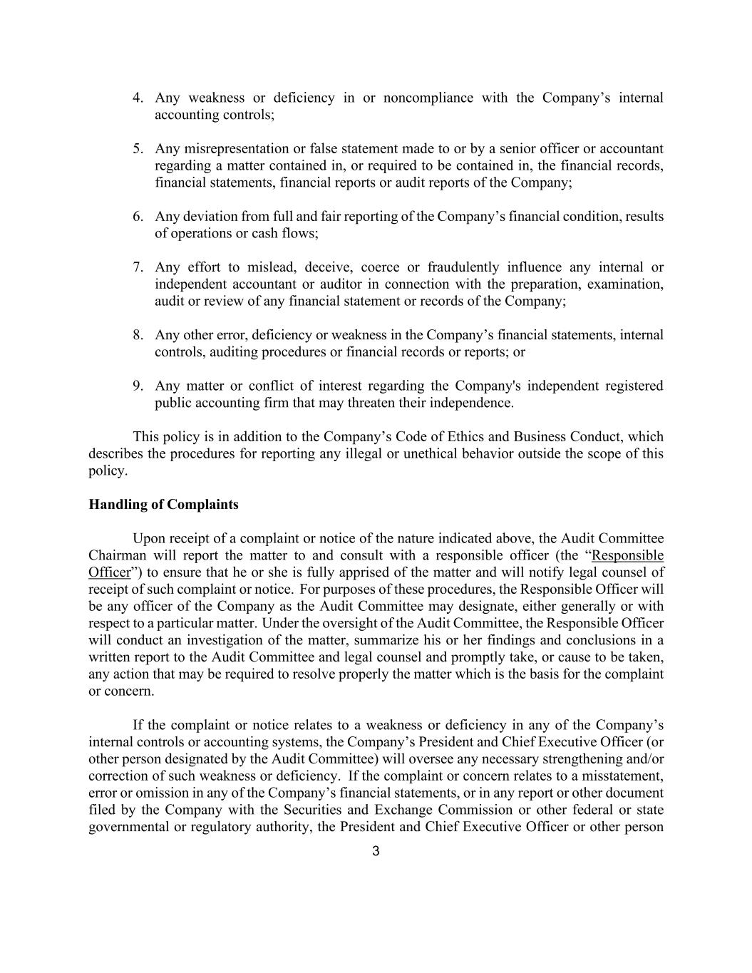 3 4. Any weakness or deficiency in or noncompliance with the Company’s internal accounting controls; 5. Any misrepresentation or false statement made to or by a senior officer or accountant regarding a matter contained in, or required to be contained in, the financial records, financial statements, financial reports or audit reports of the Company; 6. Any deviation from full and fair reporting of the Company’s financial condition, results of operations or cash flows; 7. Any effort to mislead, deceive, coerce or fraudulently influence any internal or independent accountant or auditor in connection with the preparation, examination, audit or review of any financial statement or records of the Company; 8. Any other error, deficiency or weakness in the Company’s financial statements, internal controls, auditing procedures or financial records or reports; or 9. Any matter or conflict of interest regarding the Company's independent registered public accounting firm that may threaten their independence. This policy is in addition to the Company’s Code of Ethics and Business Conduct, which describes the procedures for reporting any illegal or unethical behavior outside the scope of this policy. Handling of Complaints Upon receipt of a complaint or notice of the nature indicated above, the Audit Committee Chairman will report the matter to and consult with a responsible officer (the “Responsible Officer”) to ensure that he or she is fully apprised of the matter and will notify legal counsel of receipt of such complaint or notice. For purposes of these procedures, the Responsible Officer will be any officer of the Company as the Audit Committee may designate, either generally or with respect to a particular matter. Under the oversight of the Audit Committee, the Responsible Officer will conduct an investigation of the matter, summarize his or her findings and conclusions in a written report to the Audit Committee and legal counsel and promptly take, or cause to be taken, any action that may be required to resolve properly the matter which is the basis for the complaint or concern. If the complaint or notice relates to a weakness or deficiency in any of the Company’s internal controls or accounting systems, the Company’s President and Chief Executive Officer (or other person designated by the Audit Committee) will oversee any necessary strengthening and/or correction of such weakness or deficiency. If the complaint or concern relates to a misstatement, error or omission in any of the Company’s financial statements, or in any report or other document filed by the Company with the Securities and Exchange Commission or other federal or state governmental or regulatory authority, the President and Chief Executive Officer or other person