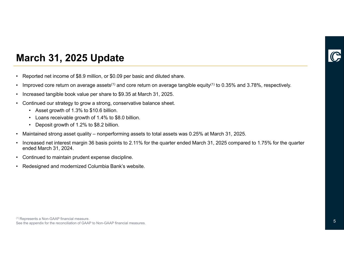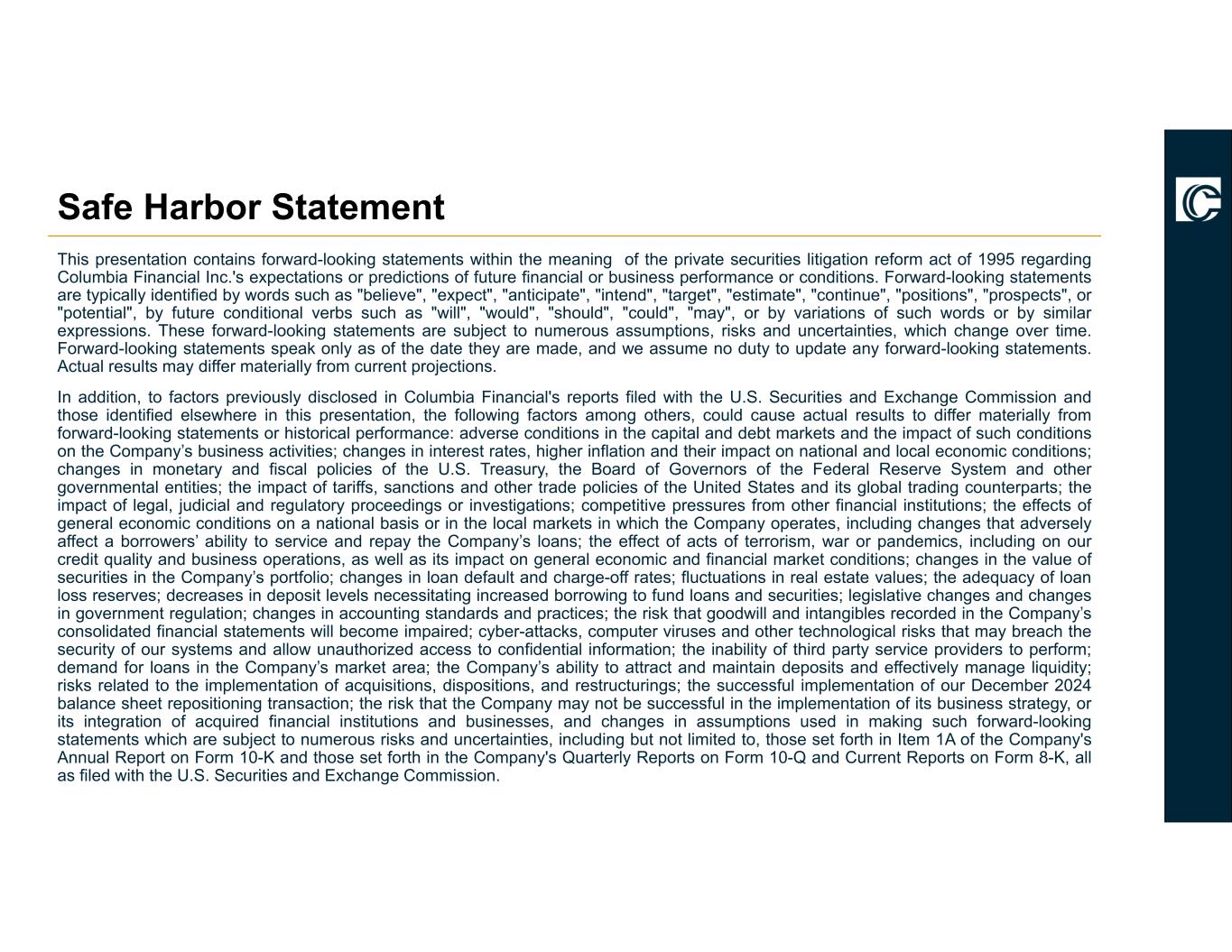 Safe Harbor Statement This presentation contains forward-looking statements within the meaning of the private securities litigation reform act of 1995 regarding Columbia Financial Inc.'s expectations or predictions of future financial or business performance or conditions. Forward-looking statements are typically identified by words such as "believe", "expect", "anticipate", "intend", "target", "estimate", "continue", "positions", "prospects", or "potential", by future conditional verbs such as "will", "would", "should", "could", "may", or by variations of such words or by similar expressions. These forward-looking statements are subject to numerous assumptions, risks and uncertainties, which change over time. Forward-looking statements speak only as of the date they are made, and we assume no duty to update any forward-looking statements. Actual results may differ materially from current projections. In addition, to factors previously disclosed in Columbia Financial's reports filed with the U.S. Securities and Exchange Commission and those identified elsewhere in this presentation, the following factors among others, could cause actual results to differ materially from forward-looking statements or historical performance: adverse conditions in the capital and debt markets and the impact of such conditions on the Company’s business activities; changes in interest rates, higher inflation and their impact on national and local economic conditions; changes in monetary and fiscal policies of the U.S. Treasury, the Board of Governors of the Federal Reserve System and other governmental entities; the impact of tariffs, sanctions and other trade policies of the United States and its global trading counterparts; the impact of legal, judicial and regulatory proceedings or investigations; competitive pressures from other financial institutions; the effects of general economic conditions on a national basis or in the local markets in which the Company operates, including changes that adversely affect a borrowers’ ability to service and repay the Company’s loans; the effect of acts of terrorism, war or pandemics, including on our credit quality and business operations, as well as its impact on general economic and financial market conditions; changes in the value of securities in the Company’s portfolio; changes in loan default and charge-off rates; fluctuations in real estate values; the adequacy of loan loss reserves; decreases in deposit levels necessitating increased borrowing to fund loans and securities; legislative changes and changes in government regulation; changes in accounting standards and practices; the risk that goodwill and intangibles recorded in the Company’s consolidated financial statements will become impaired; cyber-attacks, computer viruses and other technological risks that may breach the security of our systems and allow unauthorized access to confidential information; the inability of third party service providers to perform; demand for loans in the Company’s market area; the Company’s ability to attract and maintain deposits and effectively manage liquidity; risks related to the implementation of acquisitions, dispositions, and restructurings; the successful implementation of our December 2024 balance sheet repositioning transaction; the risk that the Company may not be successful in the implementation of its business strategy, or its integration of acquired financial institutions and businesses, and changes in assumptions used in making such forward-looking statements which are subject to numerous risks and uncertainties, including but not limited to, those set forth in Item 1A of the Company's Annual Report on Form 10-K and those set forth in the Company's Quarterly Reports on Form 10-Q and Current Reports on Form 8-K, all as filed with the U.S. Securities and Exchange Commission.
