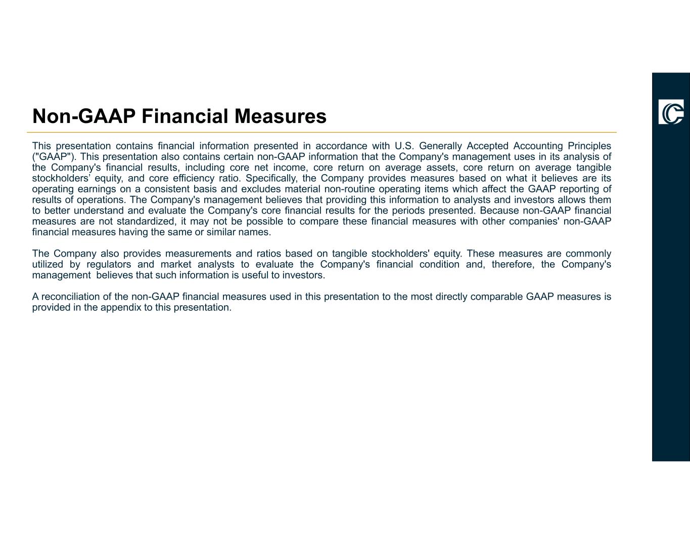 Non-GAAP Financial Measures This presentation contains financial information presented in accordance with U.S. Generally Accepted Accounting Principles ("GAAP"). This presentation also contains certain non-GAAP information that the Company's management uses in its analysis of the Company's financial results, including core net income, core return on average assets, core return on average tangible stockholders’ equity, and core efficiency ratio. Specifically, the Company provides measures based on what it believes are its operating earnings on a consistent basis and excludes material non-routine operating items which affect the GAAP reporting of results of operations. The Company's management believes that providing this information to analysts and investors allows them to better understand and evaluate the Company's core financial results for the periods presented. Because non-GAAP financial measures are not standardized, it may not be possible to compare these financial measures with other companies' non-GAAP financial measures having the same or similar names. The Company also provides measurements and ratios based on tangible stockholders' equity. These measures are commonly utilized by regulators and market analysts to evaluate the Company's financial condition and, therefore, the Company's management believes that such information is useful to investors. A reconciliation of the non-GAAP financial measures used in this presentation to the most directly comparable GAAP measures is provided in the appendix to this presentation.