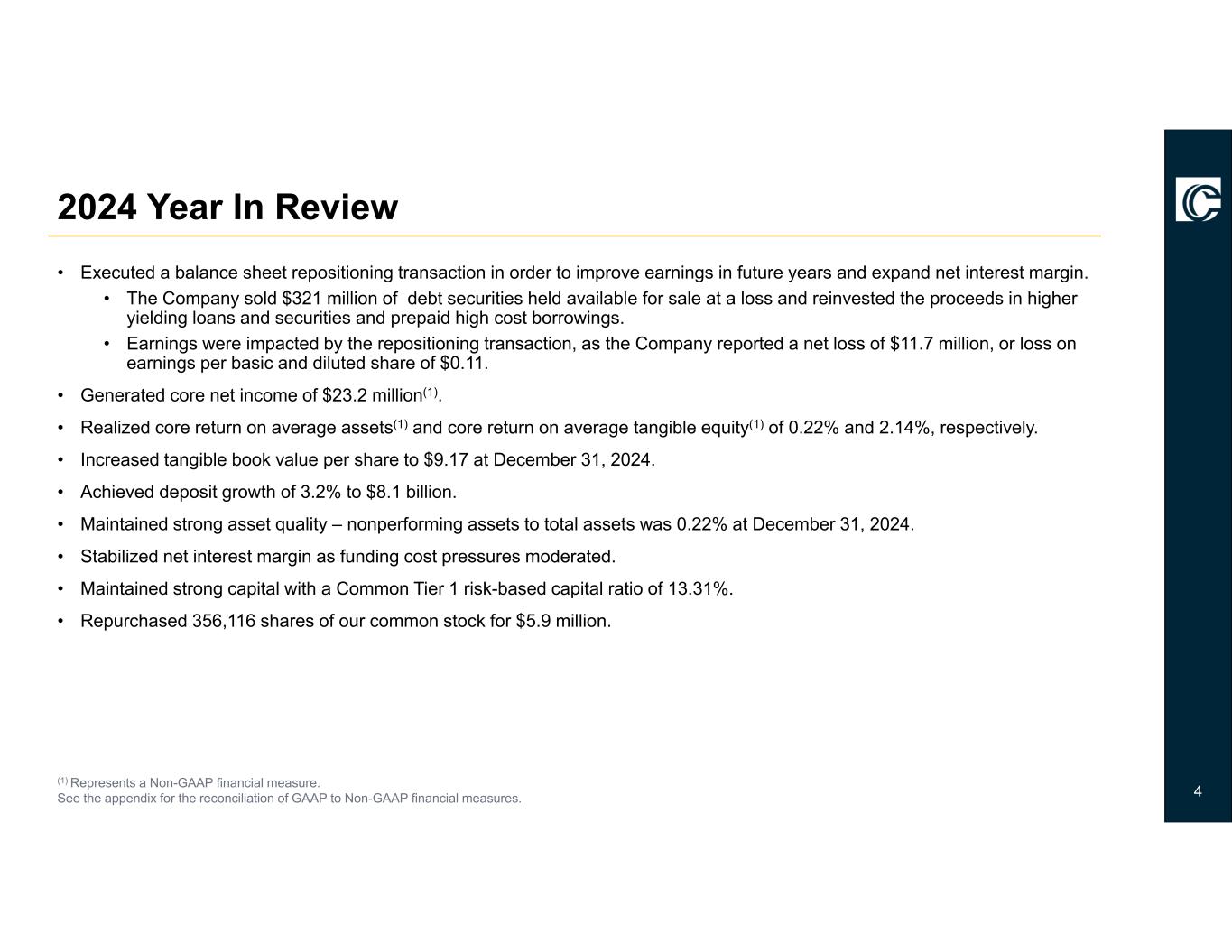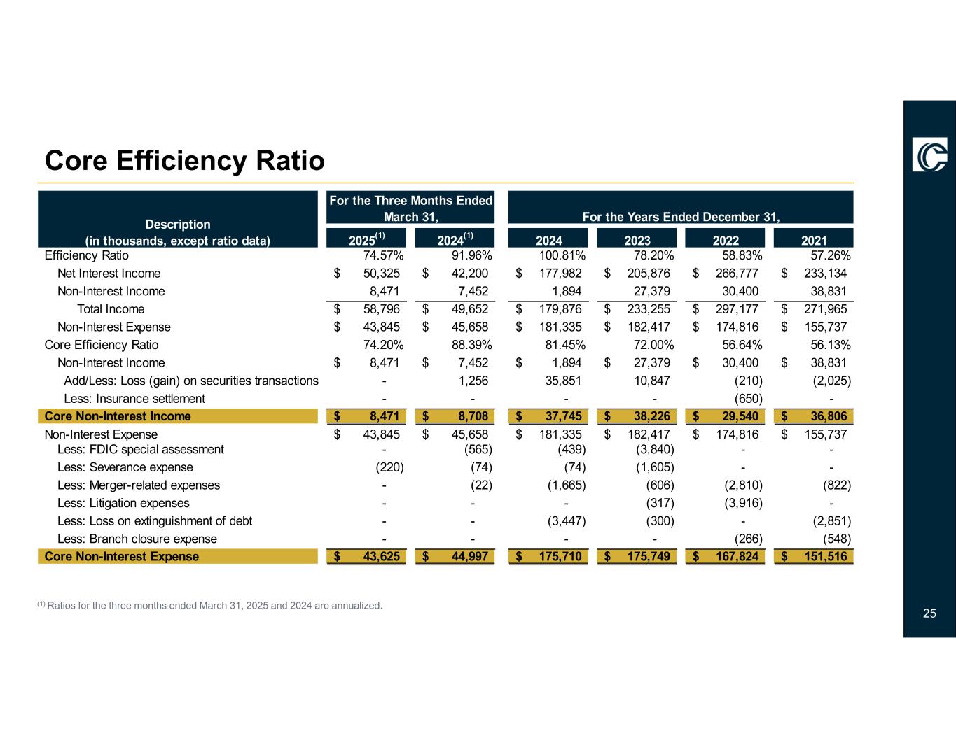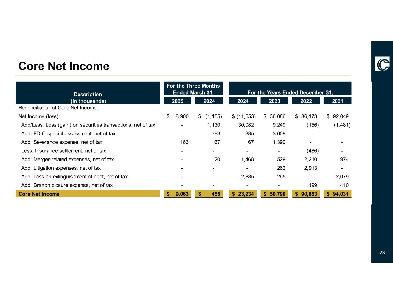 Core Net Income 2025 2024 2024 2023 2022 2021 Reconciliation of Core Net Income: Net Income (loss): 8,900$ (1,155)$ (11,653)$ 36,086$ 86,173$ 92,049$ Add/Less: Loss (gain) on securities transactions, net of tax - 1,130 30,082 9,249 (156) (1,481) Add: FDIC special assessment, net of tax - 393 385 3,009 - - Add: Severance expense, net of tax 163 67 67 1,390 - - Less: Insurance settlement, net of tax - - - - (486) - Add: Merger-related expenses, net of tax - 20 1,468 529 2,210 974 Add: Litigation expenses, net of tax - - - 262 2,913 - Add: Loss on extinguishment of debt, net of tax - - 2,885 265 - 2,079 Add: Branch closure expense, net of tax - - - - 199 410 Core Net Income 9,063$ 455$ 23,234$ 50,790$ 90,853$ 94,031$ For the Three Months Ended March 31, For the Years Ended December 31,Description (in thousands) 23