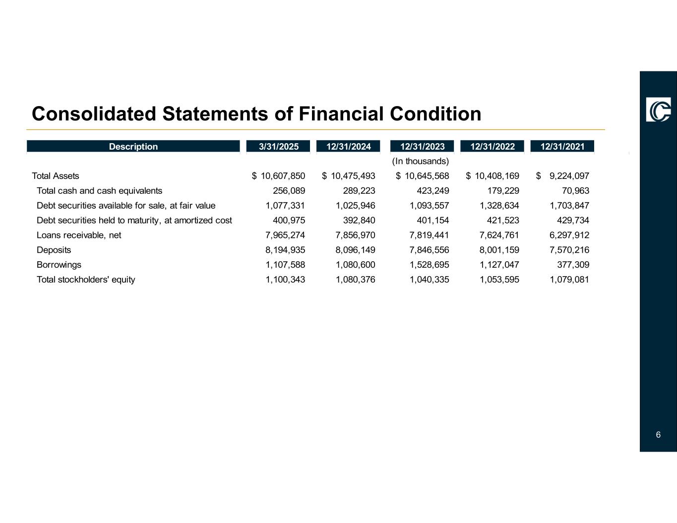 Consolidated Statements of Financial Condition Description 3/31/2025 12/31/2024 12/31/2023 12/31/2022 12/31/2021 Total Assets 10,607,850$ 10,475,493$ 10,645,568$ 10,408,169$ 9,224,097$ Total cash and cash equivalents 256,089 289,223 423,249 179,229 70,963 Debt securities available for sale, at fair value 1,077,331 1,025,946 1,093,557 1,328,634 1,703,847 Debt securities held to maturity, at amortized cost 400,975 392,840 401,154 421,523 429,734 Loans receivable, net 7,965,274 7,856,970 7,819,441 7,624,761 6,297,912 Deposits 8,194,935 8,096,149 7,846,556 8,001,159 7,570,216 Borrowings 1,107,588 1,080,600 1,528,695 1,127,047 377,309 Total stockholders' equity 1,100,343 1,080,376 1,040,335 1,053,595 1,079,081 (In thousands) 6