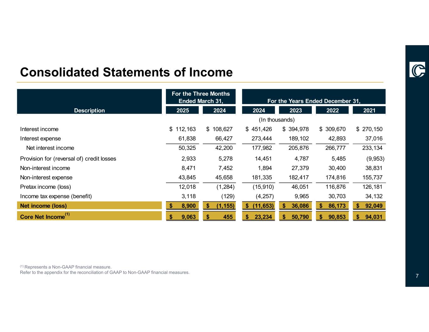 (1) Represents a Non-GAAP financial measure. Refer to the appendix for the reconciliation of GAAP to Non-GAAP financial measures. Consolidated Statements of Income 2025 2024 2024 2023 2022 2021 Interest income 112,163$ 108,627$ 451,426$ 394,978$ 309,670$ 270,150$ Interest expense 61,838 66,427 273,444 189,102 42,893 37,016 Net interest income 50,325 42,200 177,982 205,876 266,777 233,134 Provision for (reversal of) credit losses 2,933 5,278 14,451 4,787 5,485 (9,953) Non-interest income 8,471 7,452 1,894 27,379 30,400 38,831 Non-interest expense 43,845 45,658 181,335 182,417 174,816 155,737 Pretax income (loss) 12,018 (1,284) (15,910) 46,051 116,876 126,181 Income tax expense (benefit) 3,118 (129) (4,257) 9,965 30,703 34,132 Net income (loss) 8,900$ (1,155)$ (11,653)$ 36,086$ 86,173$ 92,049$ Core Net Income 9,063$ 455$ 23,234$ 50,790$ 90,853$ 94,031$ For the Three Months Ended March 31, For the Years Ended December 31, Description (In thousands) (1) 7