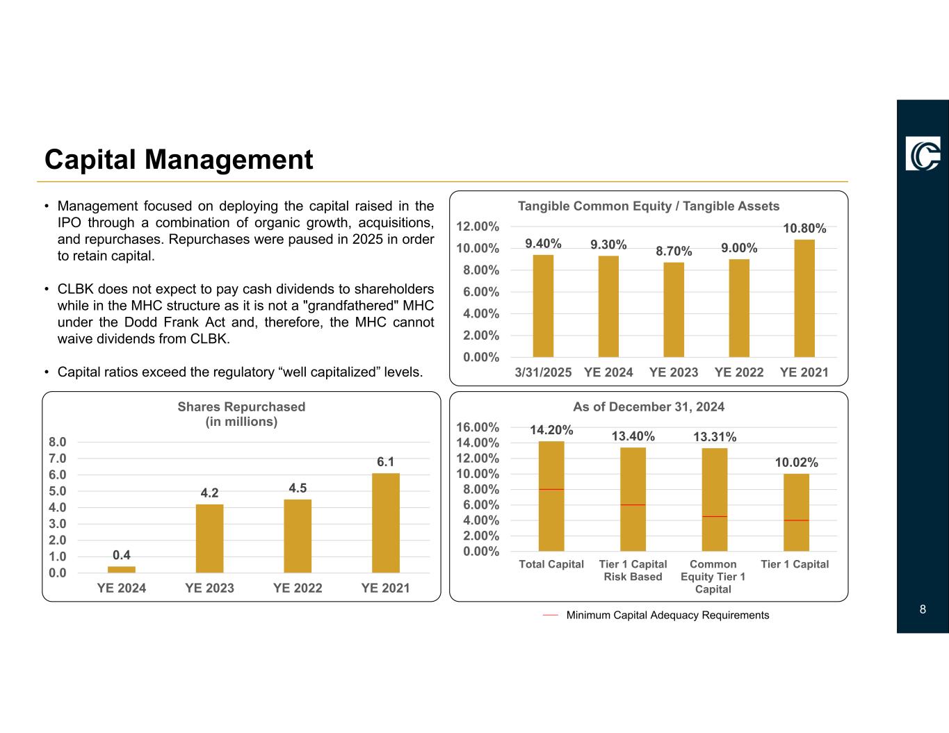 9.40% 9.30% 8.70% 9.00% 10.80% 0.00% 2.00% 4.00% 6.00% 8.00% 10.00% 12.00% 3/31/2025 YE 2024 YE 2023 YE 2022 YE 2021 Tangible Common Equity / Tangible Assets• Management focused on deploying the capital raised in the IPO through a combination of organic growth, acquisitions, and repurchases. Repurchases were paused in 2025 in order to retain capital. • CLBK does not expect to pay cash dividends to shareholders while in the MHC structure as it is not a "grandfathered" MHC under the Dodd Frank Act and, therefore, the MHC cannot waive dividends from CLBK. • Capital ratios exceed the regulatory “well capitalized” levels. Capital Management 0.4 4.2 4.5 6.1 0.0 1.0 2.0 3.0 4.0 5.0 6.0 7.0 8.0 YE 2024 YE 2023 YE 2022 YE 2021 Shares Repurchased (in millions) 14.20% 13.40% 13.31% 10.02% 0.00% 2.00% 4.00% 6.00% 8.00% 10.00% 12.00% 14.00% 16.00% Total Capital Tier 1 Capital Risk Based Common Equity Tier 1 Capital Tier 1 Capital As of December 31, 2024 Minimum Capital Adequacy Requirements 8