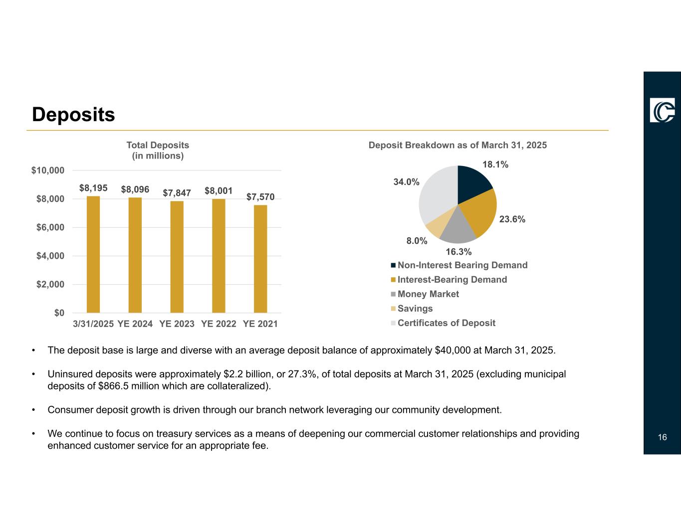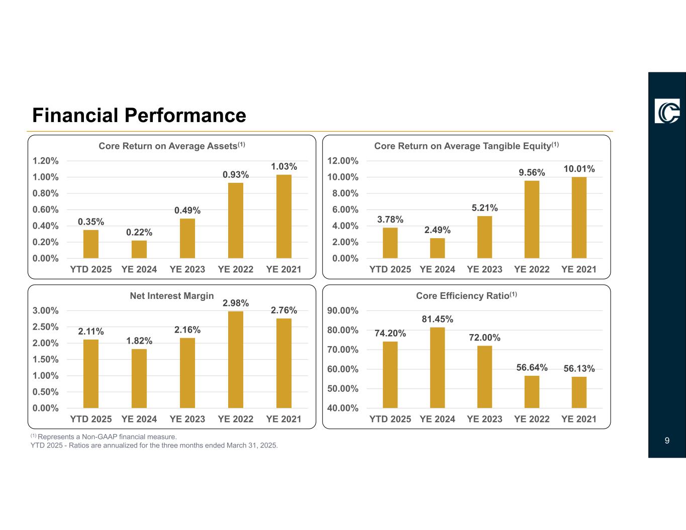 (1) Represents a Non-GAAP financial measure. YTD 2025 - Ratios are annualized for the three months ended March 31, 2025. Financial Performance 0.35% 0.22% 0.49% 0.93% 1.03% 0.00% 0.20% 0.40% 0.60% 0.80% 1.00% 1.20% YTD 2025 YE 2024 YE 2023 YE 2022 YE 2021 Core Return on Average Assets(1) 3.78% 2.49% 5.21% 9.56% 10.01% 0.00% 2.00% 4.00% 6.00% 8.00% 10.00% 12.00% YTD 2025 YE 2024 YE 2023 YE 2022 YE 2021 Core Return on Average Tangible Equity(1) 2.11% 1.82% 2.16% 2.98% 2.76% 0.00% 0.50% 1.00% 1.50% 2.00% 2.50% 3.00% YTD 2025 YE 2024 YE 2023 YE 2022 YE 2021 Net Interest Margin 74.20% 81.45% 72.00% 56.64% 56.13% 40.00% 50.00% 60.00% 70.00% 80.00% 90.00% YTD 2025 YE 2024 YE 2023 YE 2022 YE 2021 Core Efficiency Ratio(1) 9