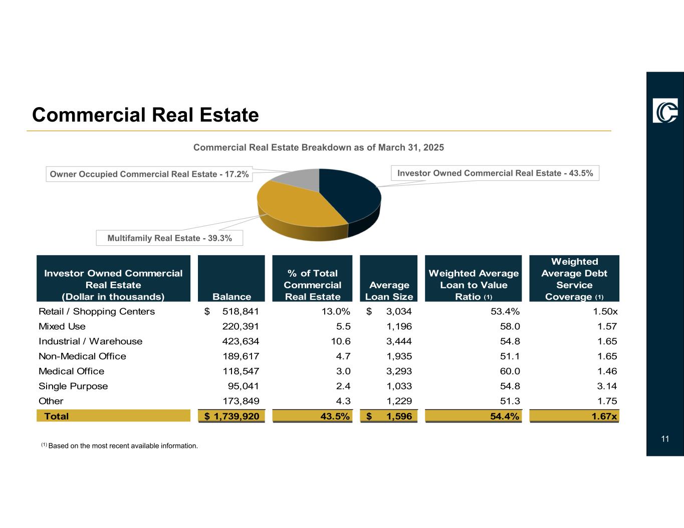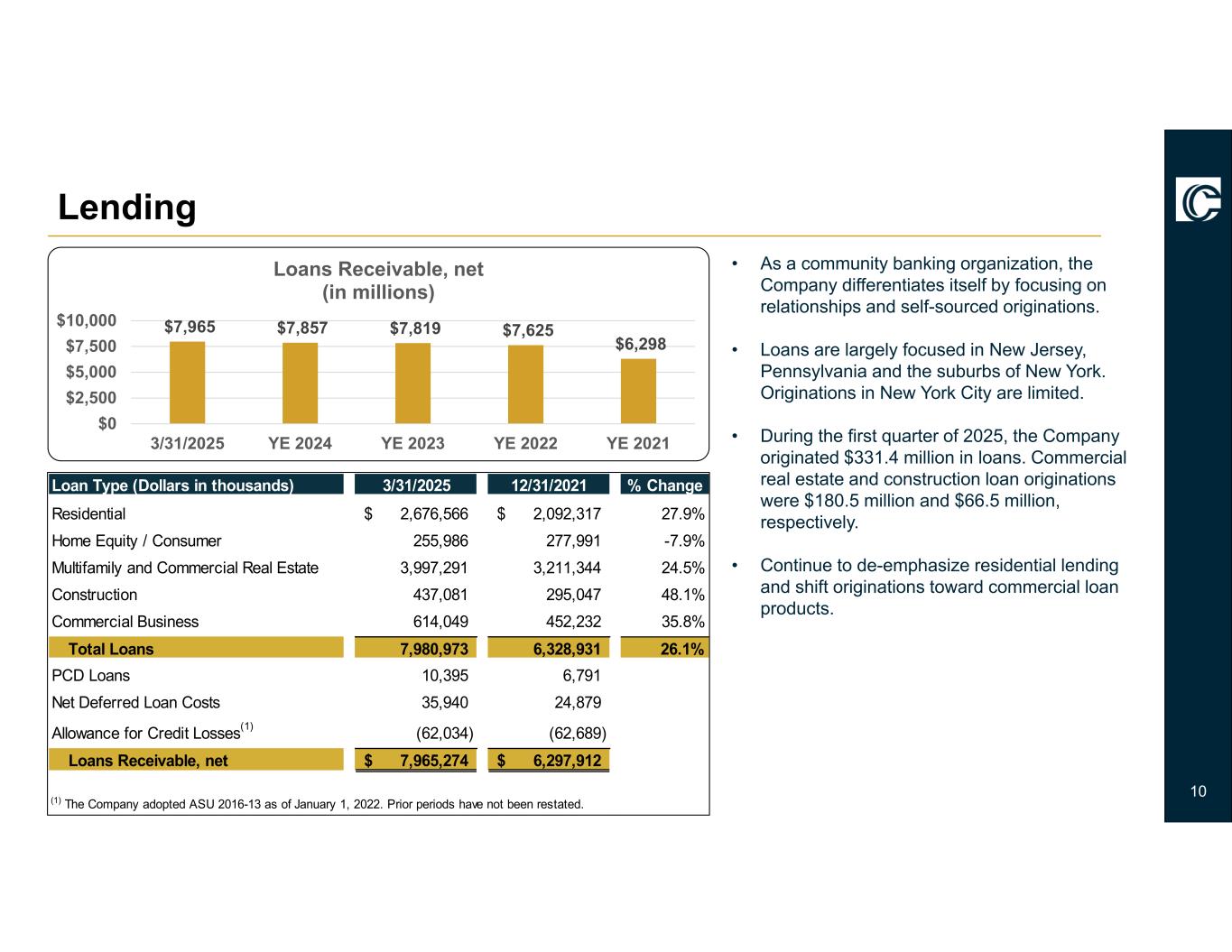 Lending $7,965 $7,857 $7,819 $7,625 $6,298 $0 $2,500 $5,000 $7,500 $10,000 3/31/2025 YE 2024 YE 2023 YE 2022 YE 2021 Loans Receivable, net (in millions) • As a community banking organization, the Company differentiates itself by focusing on relationships and self-sourced originations. • Loans are largely focused in New Jersey, Pennsylvania and the suburbs of New York. Originations in New York City are limited. • During the first quarter of 2025, the Company originated $331.4 million in loans. Commercial real estate and construction loan originations were $180.5 million and $66.5 million, respectively. • Continue to de-emphasize residential lending and shift originations toward commercial loan products. Loan Type (Dollars in thousands) 3/31/2025 12/31/2021 % Change Residential 2,676,566$ 2,092,317$ 27.9% Home Equity / Consumer 255,986 277,991 -7.9% Multifamily and Commercial Real Estate 3,997,291 3,211,344 24.5% Construction 437,081 295,047 48.1% Commercial Business 614,049 452,232 35.8% Total Loans 7,980,973 6,328,931 26.1% PCD Loans 10,395 6,791 Net Deferred Loan Costs 35,940 24,879 Allowance for Credit Losses(1) (62,034) (62,689) Loans Receivable, net 7,965,274$ 6,297,912$ (1) The Company adopted ASU 2016-13 as of January 1, 2022. Prior periods have not been restated. 10