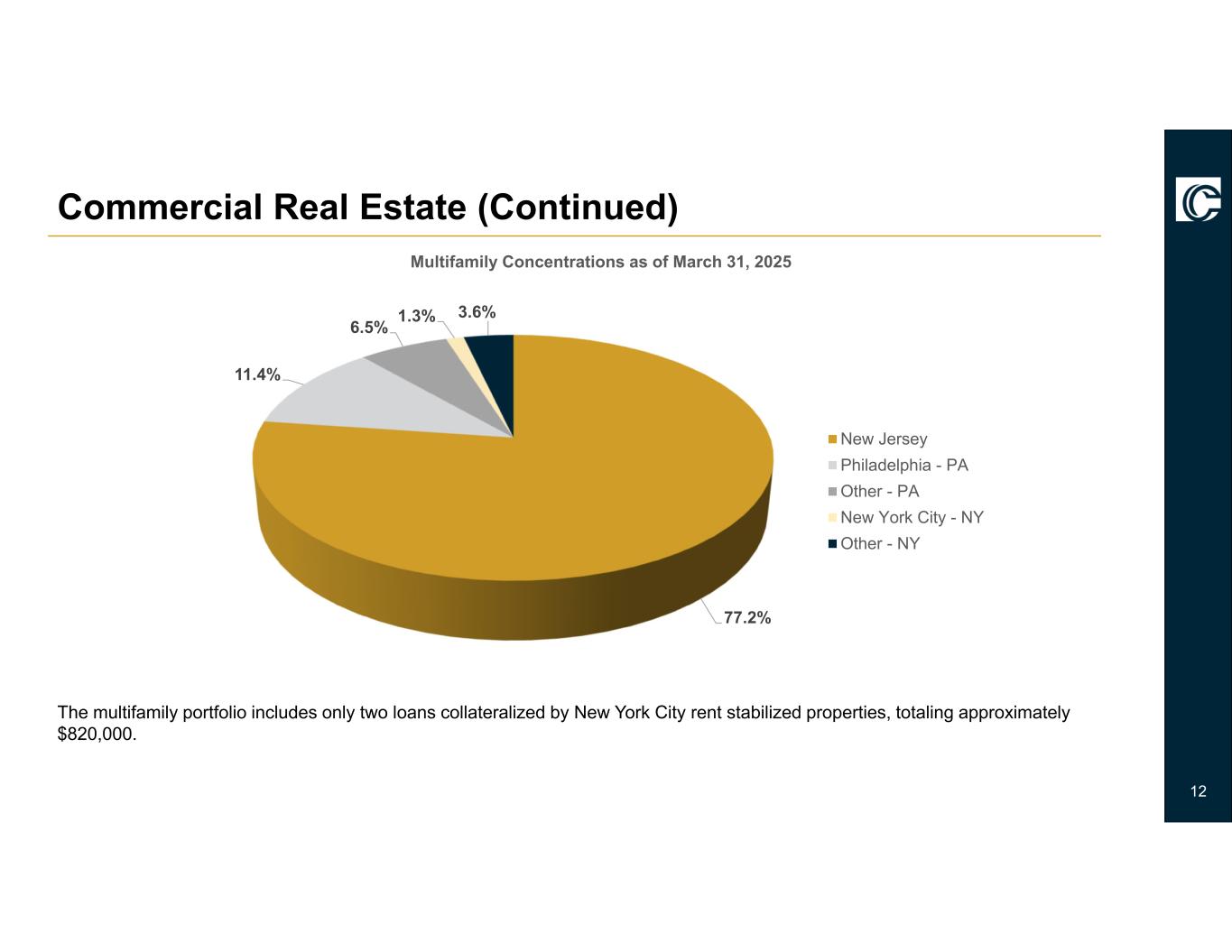 Commercial Real Estate Investor Owned Commercial Real Estate - 43.5% Multifamily Real Estate - 39.3% Owner Occupied Commercial Real Estate - 17.2% Commercial Real Estate Breakdown as of March 31, 2025 Investor Owned Commercial Real Estate (Dollar in thousands) Balance % of Total Commercial Real Estate Average Loan Size Weighted Average Loan to Value Ratio (1) Weighted Average Debt Service Coverage (1) Retail / Shopping Centers 518,841$ 13.0% 3,034$ 53.4% 1.50x Mixed Use 220,391 5.5 1,196 58.0 1.57 Industrial / Warehouse 423,634 10.6 3,444 54.8 1.65 Non-Medical Office 189,617 4.7 1,935 51.1 1.65 Medical Office 118,547 3.0 3,293 60.0 1.46 Single Purpose 95,041 2.4 1,033 54.8 3.14 Other 173,849 4.3 1,229 51.3 1.75 Total 1,739,920$ 43.5% 1,596$ 54.4% 1.67x 11 (1) Based on the most recent available information.