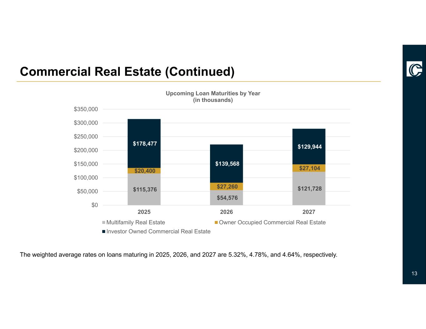 Commercial Real Estate (Continued) 77.2% 11.4% 6.5% 1.3% 3.6% Multifamily Concentrations as of March 31, 2025 New Jersey Philadelphia - PA Other - PA New York City - NY Other - NY The multifamily portfolio includes only two loans collateralized by New York City rent stabilized properties, totaling approximately $820,000. 12