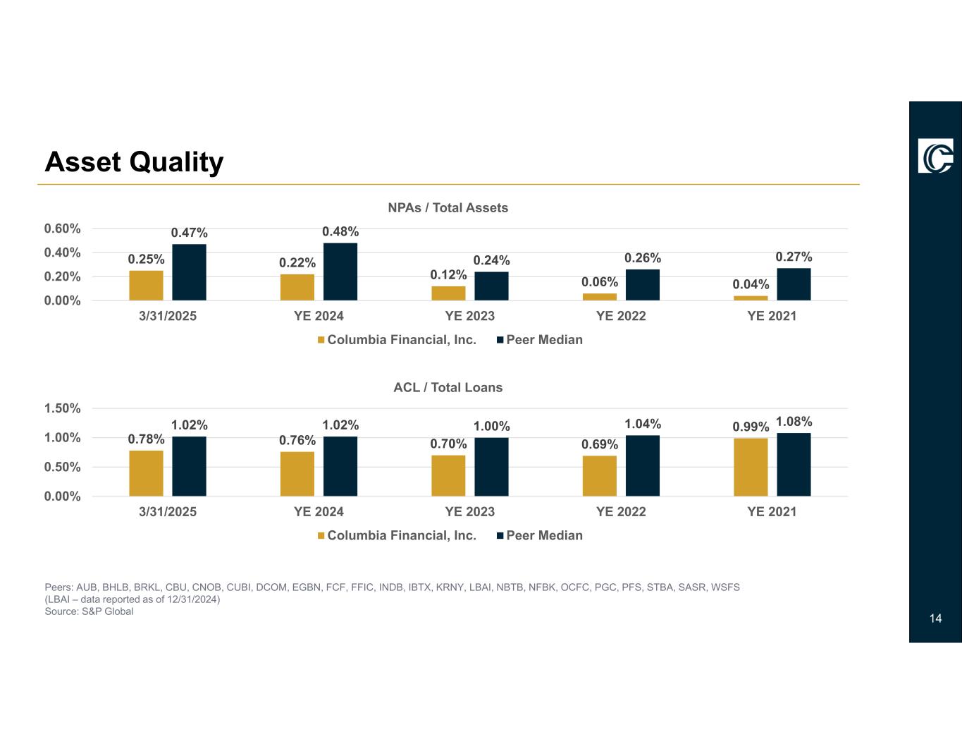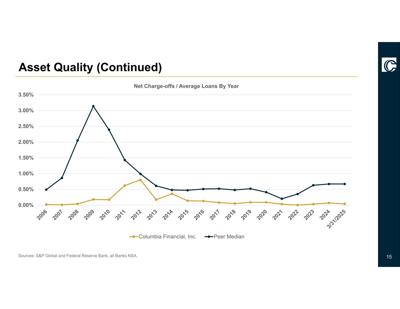 Peers: AUB, BHLB, BRKL, CBU, CNOB, CUBI, DCOM, EGBN, FCF, FFIC, INDB, IBTX, KRNY, LBAI, NBTB, NFBK, OCFC, PGC, PFS, STBA, SASR, WSFS (LBAI – data reported as of 12/31/2024) Source: S&P Global Asset Quality 0.25% 0.22% 0.12% 0.06% 0.04% 0.47% 0.48% 0.24% 0.26% 0.27% 0.00% 0.20% 0.40% 0.60% 3/31/2025 YE 2024 YE 2023 YE 2022 YE 2021 NPAs / Total Assets Columbia Financial, Inc. Peer Median 0.78% 0.76% 0.70% 0.69% 0.99%1.02% 1.02% 1.00% 1.04% 1.08% 0.00% 0.50% 1.00% 1.50% 3/31/2025 YE 2024 YE 2023 YE 2022 YE 2021 ACL / Total Loans Columbia Financial, Inc. Peer Median 14