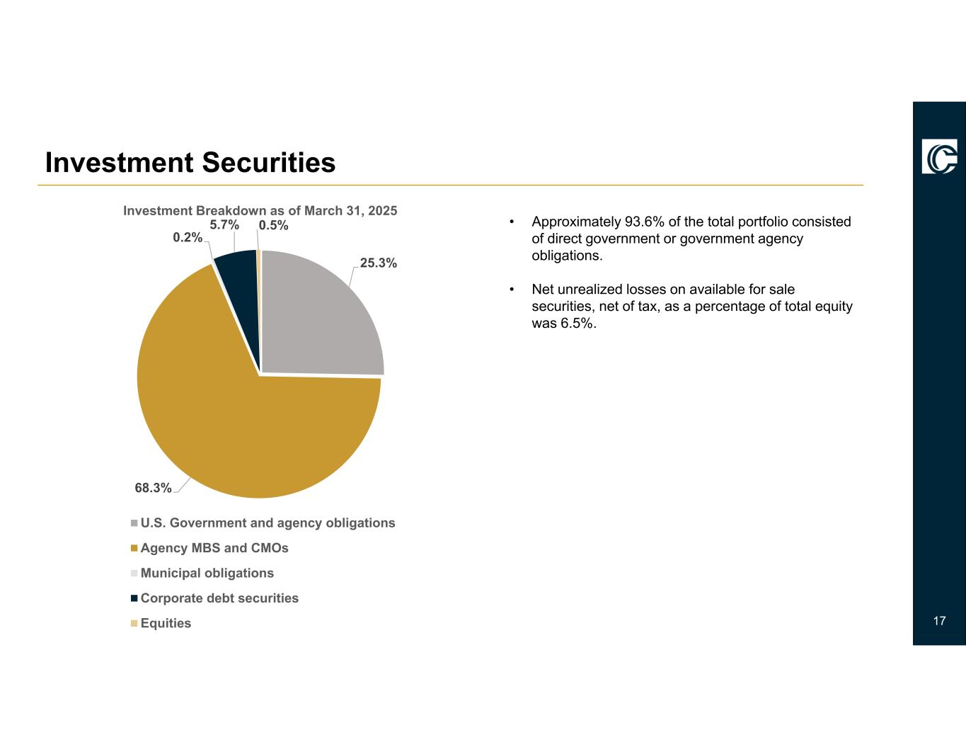Deposits $8,195 $8,096 $7,847 $8,001 $7,570 $0 $2,000 $4,000 $6,000 $8,000 $10,000 3/31/2025 YE 2024 YE 2023 YE 2022 YE 2021 Total Deposits (in millions) 18.1% 23.6% 16.3% 8.0% 34.0% Deposit Breakdown as of March 31, 2025 Non-Interest Bearing Demand Interest-Bearing Demand Money Market Savings Certificates of Deposit • The deposit base is large and diverse with an average deposit balance of approximately $40,000 at March 31, 2025. • Uninsured deposits were approximately $2.2 billion, or 27.3%, of total deposits at March 31, 2025 (excluding municipal deposits of $866.5 million which are collateralized). • Consumer deposit growth is driven through our branch network leveraging our community development. • We continue to focus on treasury services as a means of deepening our commercial customer relationships and providing enhanced customer service for an appropriate fee. 16