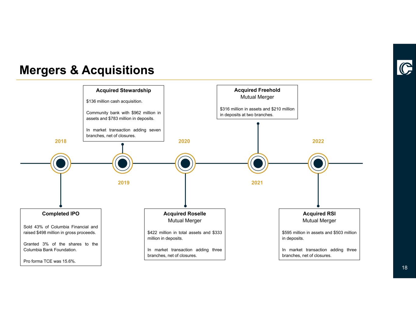 Completed IPO Sold 43% of Columbia Financial and raised $498 million in gross proceeds. Granted 3% of the shares to the Columbia Bank Foundation. Pro forma TCE was 15.6%. 2018 2020 2022 2019 2021 Acquired Roselle Mutual Merger $422 million in total assets and $333 million in deposits. In market transaction adding three branches, net of closures. Acquired RSI Mutual Merger $595 million in assets and $503 million in deposits. In market transaction adding three branches, net of closures. Acquired Freehold Mutual Merger $316 million in assets and $210 million in deposits at two branches. Acquired Stewardship $136 million cash acquisition. Community bank with $962 million in assets and $783 million in deposits. In market transaction adding seven branches, net of closures. Mergers & Acquisitions 18