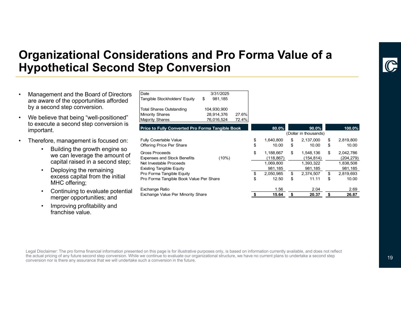 • Management and the Board of Directors are aware of the opportunities afforded by a second step conversion. • We believe that being “well-positioned” to execute a second step conversion is important. • Therefore, management is focused on: • Building the growth engine so we can leverage the amount of capital raised in a second step; • Deploying the remaining excess capital from the initial MHC offering; • Continuing to evaluate potential merger opportunities; and • Improving profitability and franchise value. Organizational Considerations and Pro Forma Value of a Hypothetical Second Step Conversion 19 Legal Disclaimer: The pro forma financial information presented on this page is for illustrative purposes only, is based on information currently available, and does not reflect the actual pricing of any future second step conversion. While we continue to evaluate our organizational structure, we have no current plans to undertake a second step conversion nor is there any assurance that we will undertake such a conversion in the future. Date 3/31/2025 Tangible Stockholders' Equity 981,185$ Total Shares Outstanding 104,930,900 Minority Shares 28,914,376 27.6% Majority Shares 76,016,524 72.4% 80.0% 90.0% 100.0% Fully Covertable Value 1,640,800$ 2,137,000$ 2,819,800$ Offering Price Per Share 10.00$ 10.00$ 10.00$ Gross Proceeds 1,188,667$ 1,548,136$ 2,042,786$ Expenses and Stock Benefits (10%) (118,867) (154,814) (204,279) Net Investable Proceeds 1,069,800 1,393,322 1,838,508 Existing Tangible Equity 981,185 981,185 981,185 Pro Forma Tangible Equity 2,050,985$ 2,374,507$ 2,819,693$ Pro Forma Tangible Book Value Per Share 12.50$ 11.11$ 10.00$ Exchange Ratio 1.56 2.04 2.69 Exchange Value Per Minority Share 15.64$ 20.37$ 26.87$ Price to Fully Converted Pro Forma Tangible Book (Dollar in thousands)