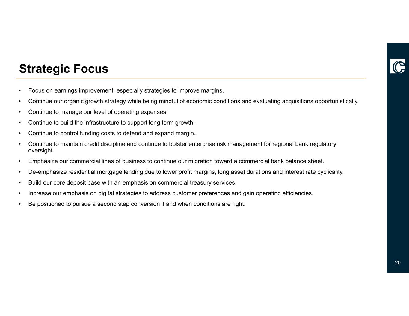• Focus on earnings improvement, especially strategies to improve margins. • Continue our organic growth strategy while being mindful of economic conditions and evaluating acquisitions opportunistically. • Continue to manage our level of operating expenses. • Continue to build the infrastructure to support long term growth. • Continue to control funding costs to defend and expand margin. • Continue to maintain credit discipline and continue to bolster enterprise risk management for regional bank regulatory oversight. • Emphasize our commercial lines of business to continue our migration toward a commercial bank balance sheet. • De-emphasize residential mortgage lending due to lower profit margins, long asset durations and interest rate cyclicality. • Build our core deposit base with an emphasis on commercial treasury services. • Increase our emphasis on digital strategies to address customer preferences and gain operating efficiencies. • Be positioned to pursue a second step conversion if and when conditions are right. Strategic Focus 20