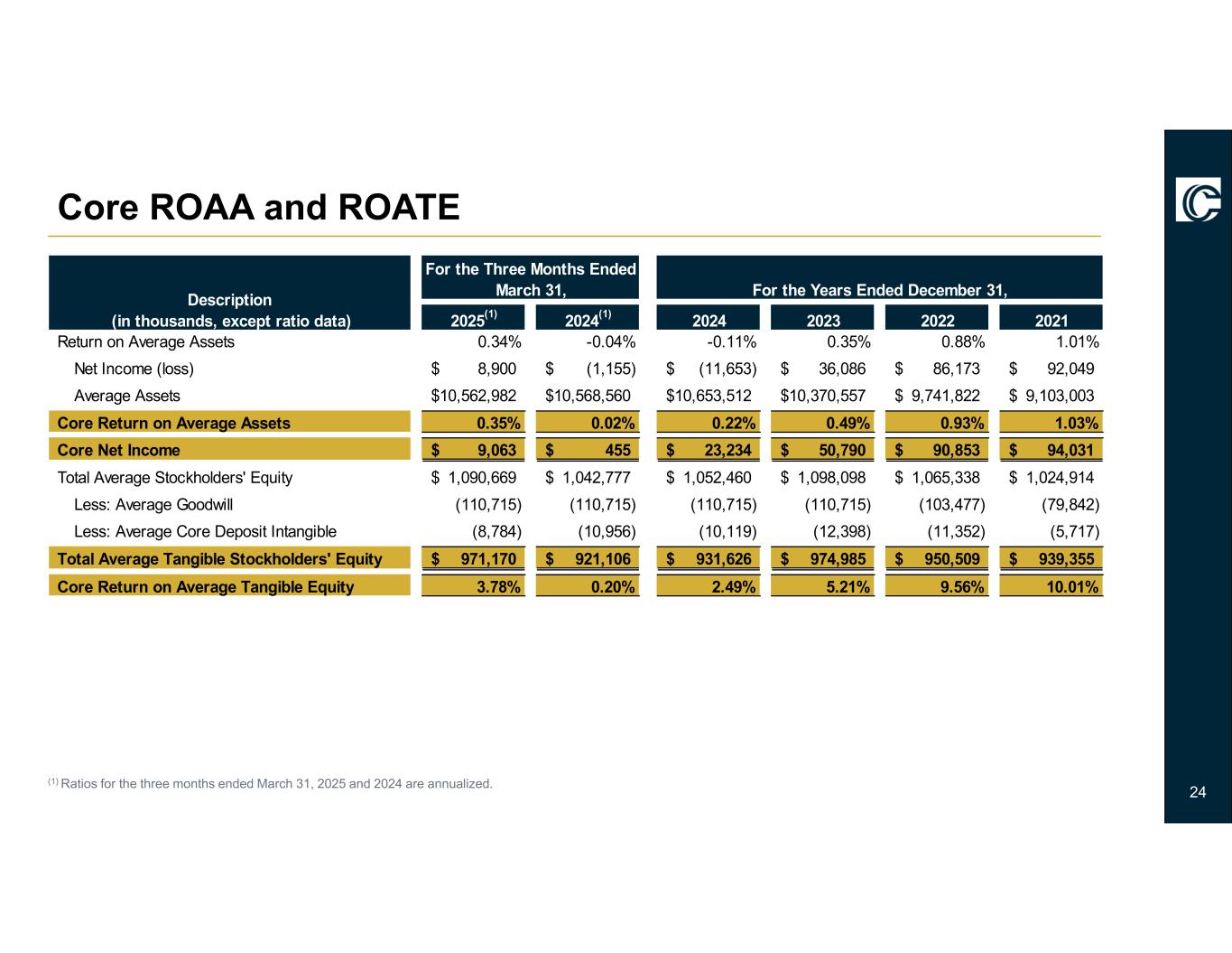 Core ROAA and ROATE 2025(1) 2024(1) 2024 2023 2022 2021 Return on Average Assets 0.34% -0.04% -0.11% 0.35% 0.88% 1.01% Net Income (loss) 8,900$ (1,155)$ (11,653)$ 36,086$ 86,173$ 92,049$ Average Assets 10,562,982$ 10,568,560$ 10,653,512$ 10,370,557$ 9,741,822$ 9,103,003$ Core Return on Average Assets 0.35% 0.02% 0.22% 0.49% 0.93% 1.03% Core Net Income 9,063$ 455$ 23,234$ 50,790$ 90,853$ 94,031$ Total Average Stockholders' Equity 1,090,669$ 1,042,777$ 1,052,460$ 1,098,098$ 1,065,338$ 1,024,914$ Less: Average Goodwill (110,715) (110,715) (110,715) (110,715) (103,477) (79,842) Less: Average Core Deposit Intangible (8,784) (10,956) (10,119) (12,398) (11,352) (5,717) Total Average Tangible Stockholders' Equity 971,170$ 921,106$ 931,626$ 974,985$ 950,509$ 939,355$ Core Return on Average Tangible Equity 3.78% 0.20% 2.49% 5.21% 9.56% 10.01% For the Three Months Ended March 31, For the Years Ended December 31,Description (in thousands, except ratio data) (1) Ratios for the three months ended March 31, 2025 and 2024 are annualized. 24