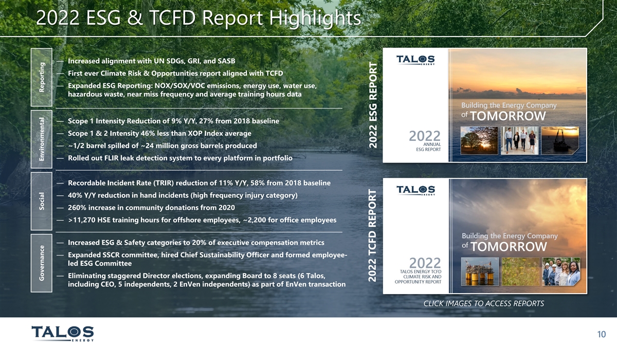 2022 ESG & TCFD Report Highlights ― Increased alignment with UN SDGs, GRI, and SASB ― First ever Climate Risk & Opportunities report aligned with TCFD ― Expanded ESG Reporting: NOX/SOX/VOC emissions, energy use, water use, hazardous waste, near miss frequency and average training hours data ― Scope 1 Intensity Reduction of 9% Y/Y, 27% from 2018 baseline ― Scope 1 & 2 Intensity 46% less than XOP Index average ― ~1/2 barrel spilled of ~24 million gross barrels produced ― Rolled out FLIR leak detection system to every platform in portfolio ― Recordable Incident Rate (TRIR) reduction of 11% Y/Y, 58% from 2018 baseline ― 40% Y/Y reduction in hand incidents (high frequency injury category) ― 260% increase in community donations from 2020 ― >11,270 HSE training hours for offshore employees, ~2,200 for office employees ― Increased ESG & Safety categories to 20% of executive compensation metrics ― Expanded SSCR committee, hired Chief Sustainability Officer and formed employee- led ESG Committee ― Eliminating staggered Director elections, expanding Board to 8 seats (6 Talos, including CEO, 5 independents, 2 EnVen independents) as part of EnVen transaction CLICK IMAGES TO ACCESS REPORTS 10 Governance Social Environmental Reporting 2022 TCFD REPORT 2022 ESG REPORT