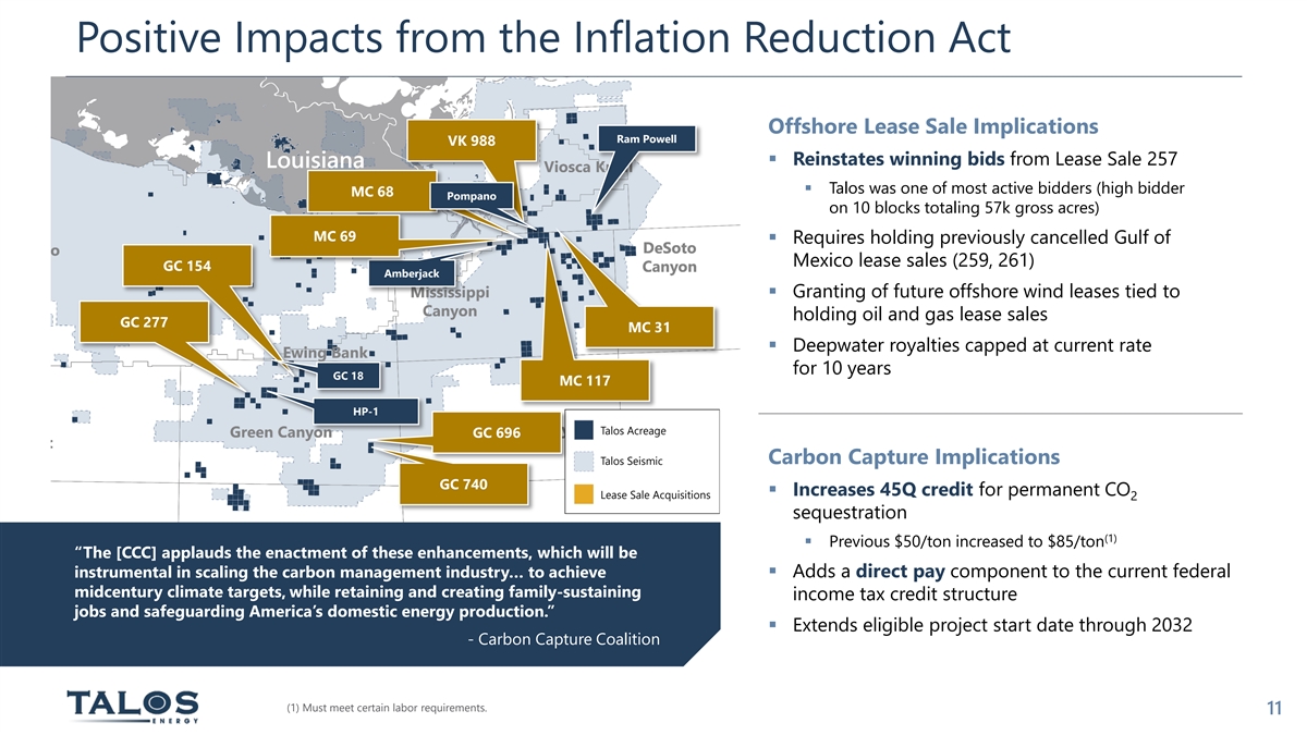 Positive Impacts from the Inflation Reduction Act Offshore Lease Sale Implications Ram Powell VK 988 § Reinstates winning bids from Lease Sale 257 § Talos was one of most active bidders (high bidder MC 68 Pompano on 10 blocks totaling 57k gross acres) MC 69 § Requires holding previously cancelled Gulf of Mexico lease sales (259, 261) GC 154 Amberjack § Granting of future offshore wind leases tied to holding oil and gas lease sales GC 277 MC 31 § Deepwater royalties capped at current rate for 10 years GC 18 MC 117 HP-1 GC 696 Carbon Capture Implications GC 740 § Increases 45Q credit for permanent CO 2 sequestration (1) § Previous $50/ton increased to $85/ton “The [CCC] applauds the enactment of these enhancements, which will be § Adds a direct pay component to the current federal instrumental in scaling the carbon management industry… to achieve midcentury climate targets, while retaining and creating family-sustaining income tax credit structure jobs and safeguarding America’s domestic energy production.” § Extends eligible project start date through 2032 - Carbon Capture Coalition (1) Must meet certain labor requirements. 11