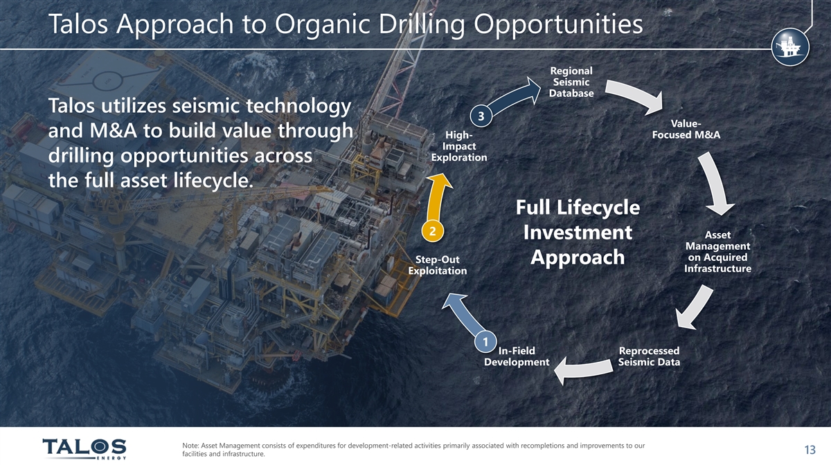 Talos Approach to Organic Drilling Opportunities Regional Seismic Database Talos utilizes seismic technology 3 Value- and M&A to build value through High- Focused M&A Impact Exploration drilling opportunities across the full asset lifecycle. Full Lifecycle 2 Asset Investment Management on Acquired Step-Out Approach Infrastructure Exploitation 1 In-Field Reprocessed Development Seismic Data Note: Asset Management consists of expenditures for development-related activities primarily associated with recompletions and improvements to our 13 facilities and infrastructure.