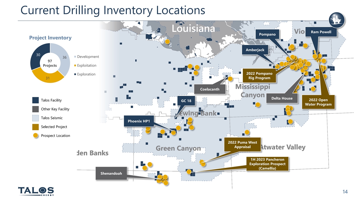 Current Drilling Inventory Locations Ram Powell Pompano Project Inventory Amberjack 30 Development 36 97 Projects Exploitation 2022 Pompano Exploration Rig Program 31 Coelacanth Delta House 2022 Open Talos Facility GC 18 Water Program Other Key Facility Talos Seismic Phoenix HP1 Selected Project Prospect Location 2022 Puma West Appraisal 1H 2023 Pancheron Exploration Prospect (Camellia) Shenandoah 14