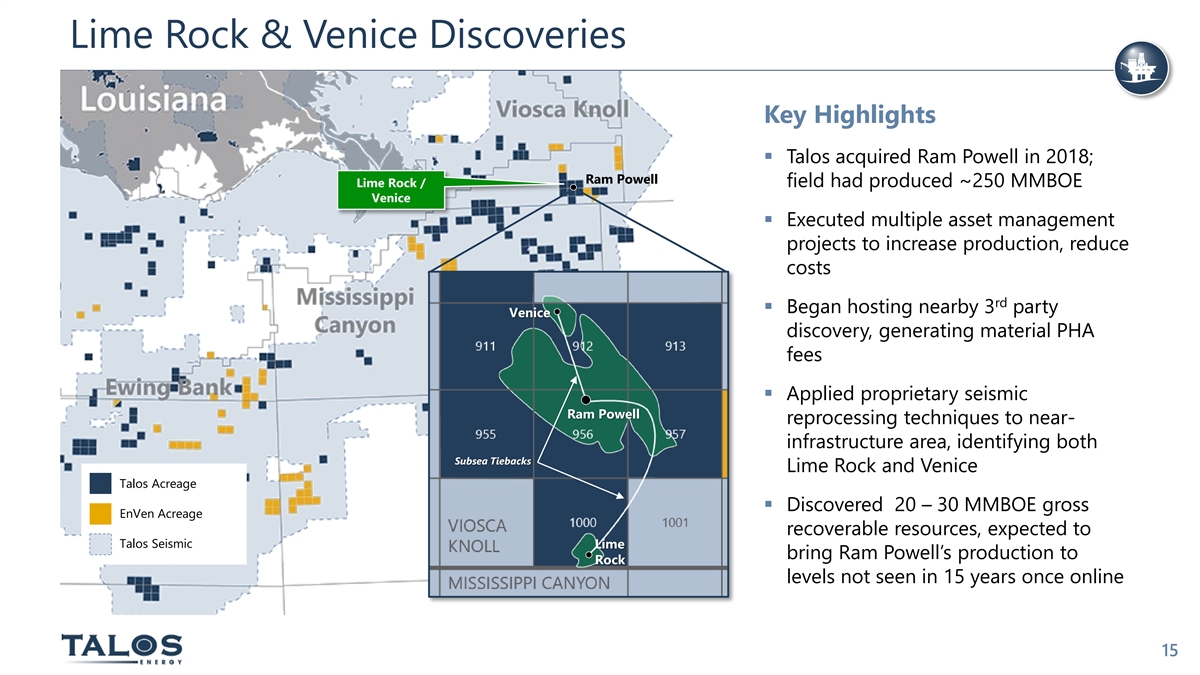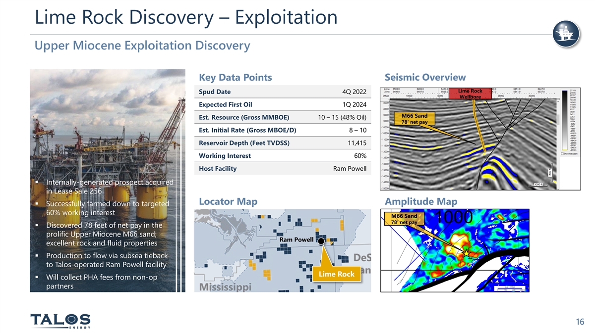 Lime Rock & Venice Discoveries Key Highlights § Talos acquired Ram Powell in 2018; Ram Powell Lime Rock / field had produced ~250 MMBOE Venice § Executed multiple asset management projects to increase production, reduce costs rd § Began hosting nearby 3 party Venice discovery, generating material PHA fees § Applied proprietary seismic Ram Powell reprocessing techniques to near- infrastructure area, identifying both Subsea Tiebacks Lime Rock and Venice Talos Acreage § Discovered 20 – 30 MMBOE gross EnVen Acreage recoverable resources, expected to Talos Seismic Lime bring Ram Powell’s production to Rock levels not seen in 15 years once online 15