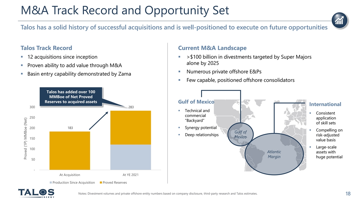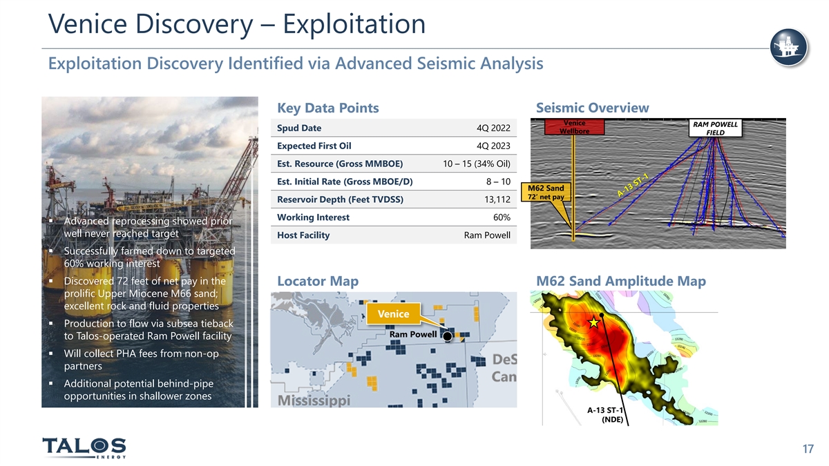 Venice Discovery – Exploitation Exploitation Discovery Identified via Advanced Seismic Analysis Seismic Overview Key Data Points Venice RAM POWELL Spud Date 4Q 2022 Wellbore FIELD Expected First Oil 4Q 2023 Est. Resource (Gross MMBOE) 10 – 15 (34% Oil) Est. Initial Rate (Gross MBOE/D) 8 – 10 M62 Sand 72’ net pay Reservoir Depth (Feet TVDSS) 13,112 Working Interest 60% § Advanced reprocessing showed prior well never reached target Host Facility Ram Powell § Successfully farmed down to targeted 60% working interest § Discovered 72 feet of net pay in the Locator Map M62 Sand Amplitude Map prolific Upper Miocene M66 sand; excellent rock and fluid properties Venice § Production to flow via subsea tieback Ram Powell to Talos-operated Ram Powell facility § Will collect PHA fees from non-op partners § Additional potential behind-pipe opportunities in shallower zones A-13 ST-1 (NDE) 17
