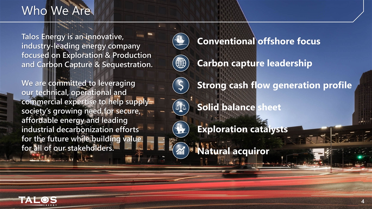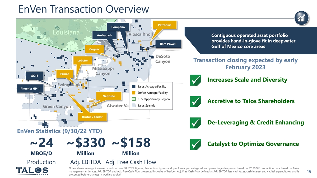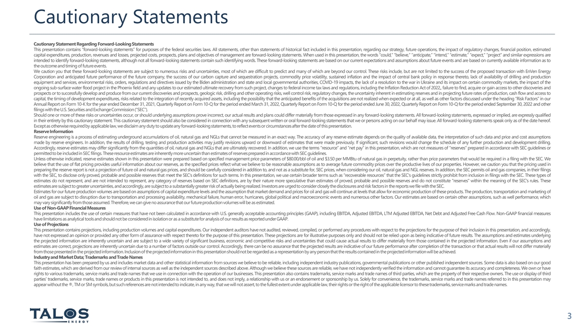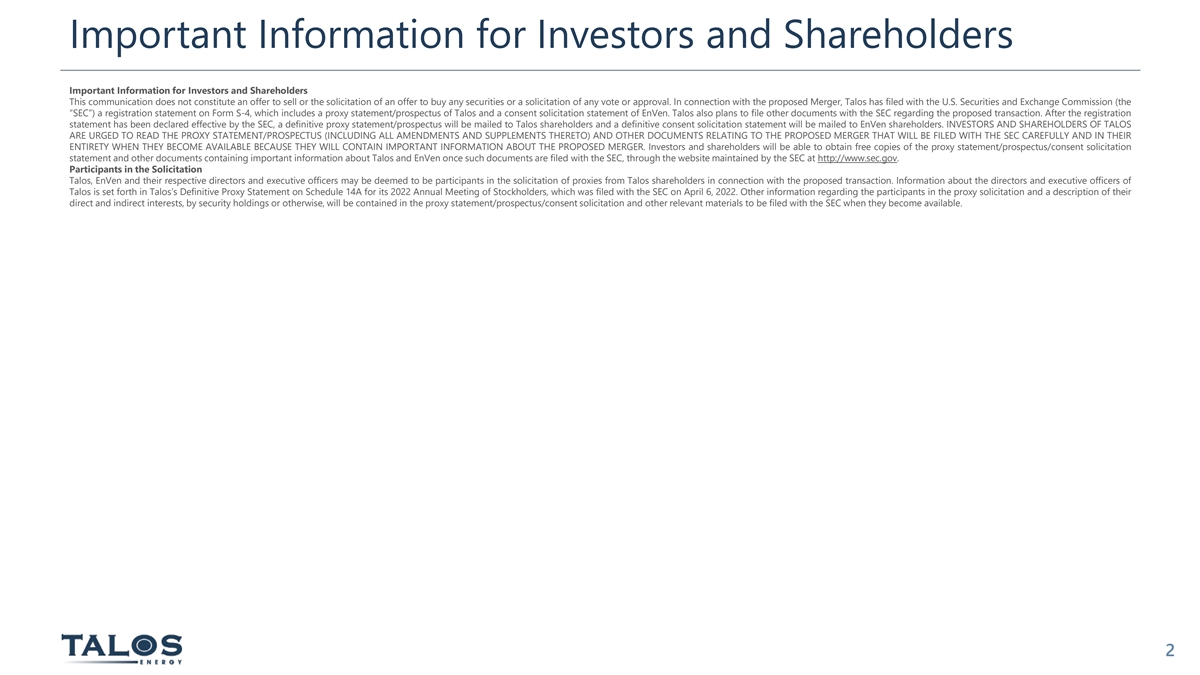 Important Information for Investors and Shareholders Important Information for Investors and Shareholders This communication does not constitute an offer to sell or the solicitation of an offer to buy any securities or a solicitation of any vote or approval. In connection with the proposed Merger, Talos has filed with the U.S. Securities and Exchange Commission (the “SEC”) a registration statement on Form S-4, which includes a proxy statement/prospectus of Talos and a consent solicitation statement of EnVen. Talos also plans to file other documents with the SEC regarding the proposed transaction. After the registration statement has been declared effective by the SEC, a definitive proxy statement/prospectus will be mailed to Talos shareholders and a definitive consent solicitation statement will be mailed to EnVen shareholders. INVESTORS AND SHAREHOLDERS OF TALOS ARE URGED TO READ THE PROXY STATEMENT/PROSPECTUS (INCLUDING ALL AMENDMENTS AND SUPPLEMENTS THERETO) AND OTHER DOCUMENTS RELATING TO THE PROPOSED MERGER THAT WILL BE FILED WITH THE SEC CAREFULLY AND IN THEIR ENTIRETY WHEN THEY BECOME AVAILABLE BECAUSE THEY WILL CONTAIN IMPORTANT INFORMATION ABOUT THE PROPOSED MERGER. Investors and shareholders will be able to obtain free copies of the proxy statement/prospectus/consent solicitation statement and other documents containing important information about Talos and EnVen once such documents are filed with the SEC, through the website maintained by the SEC at http://www.sec.gov. Participants in the Solicitation Talos, EnVen and their respective directors and executive officers may be deemed to be participants in the solicitation of proxies from Talos shareholders in connection with the proposed transaction. Information about the directors and executive officers of Talos is set forth in Talos’s Definitive Proxy Statement on Schedule 14A for its 2022 Annual Meeting of Stockholders, which was filed with the SEC on April 6, 2022. Other information regarding the participants in the proxy solicitation and a description of their direct and indirect interests, by security holdings or otherwise, will be contained in the proxy statement/prospectus/consent solicitation and other relevant materials to be filed with the SEC when they become available. 2