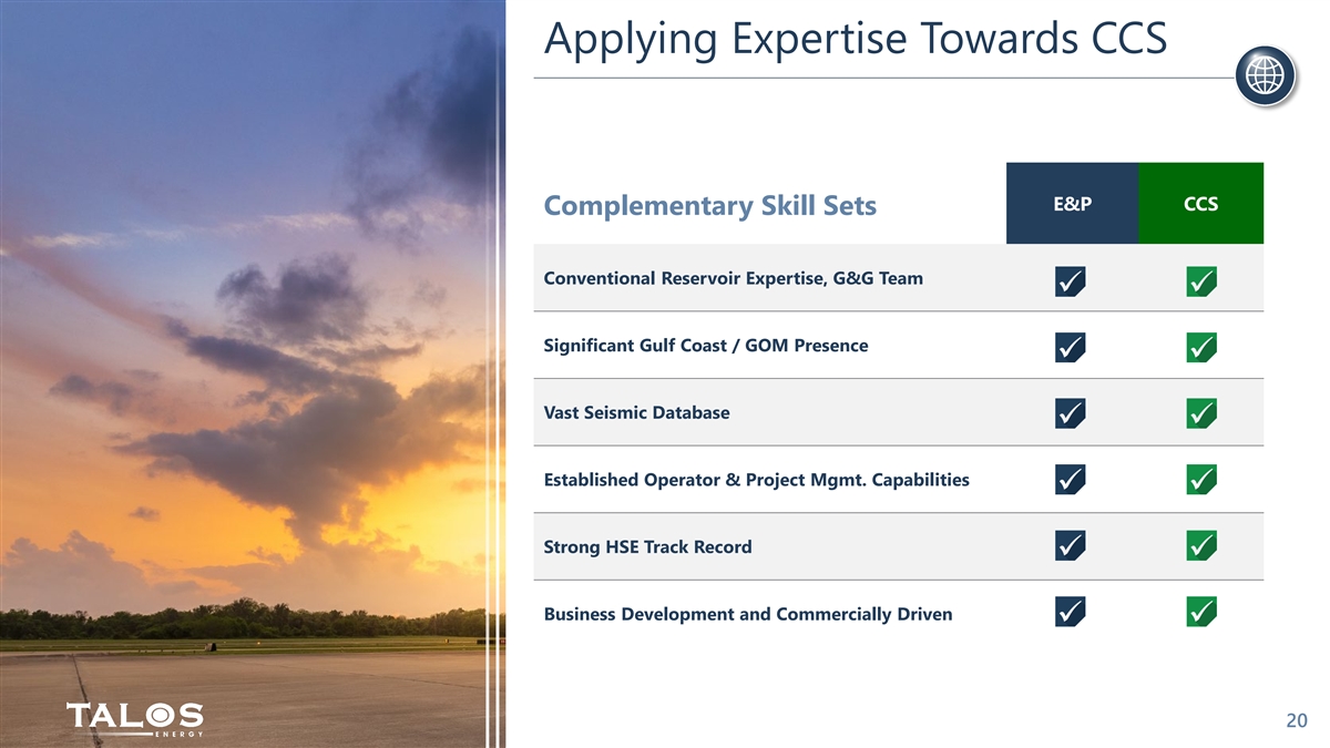 EnVen Transaction Overview Petronius Pompano Amberjack Contiguous operated asset portfolio provides hand-in-glove fit in deepwater Ram Powell Gulf of Mexico core areas Cognac Lobster Transaction closing expected by early February 2023 Prince GC18 Increases Scale and Diversity Talos Acreage/Facility Phoenix HP-1 EnVen Acreage/Facility Neptune CCS Opportunity Region Accretive to Talos Shareholders Talos Seismic Brutus / Glider De-Leveraging & Credit Enhancing EnVen Statistics (9/30/22 YTD) Catalyst to Optimize Governance ~24 ~$330 ~$158 MBOE/D Million Million Production Adj. EBITDA Adj. Free Cash Flow Notes: Gross acreage increase based on June 30, 2022 figures; Production figures and pro forma percentage oil and percentage deepwater based on FY 2022E production data based on Talos management estimates. Adj. EBITDA and Adj. Free Cash Flow presented inclusive of hedges; Adj. Free Cash Flow defined as Adj. EBITDA less cash taxes, cash interest and capital expenditures, and is 19 presented before changes in working capital.