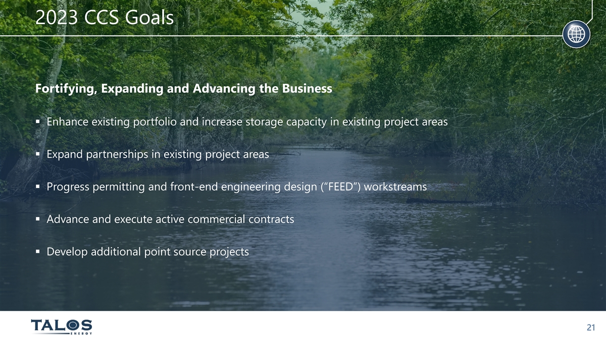 Applying Expertise Towards CCS E&P CCS Complementary Skill Sets Conventional Reservoir Expertise, G&G Team Significant Gulf Coast / GOM Presence Vast Seismic Database Established Operator & Project Mgmt. Capabilities Strong HSE Track Record Business Development and Commercially Driven 20