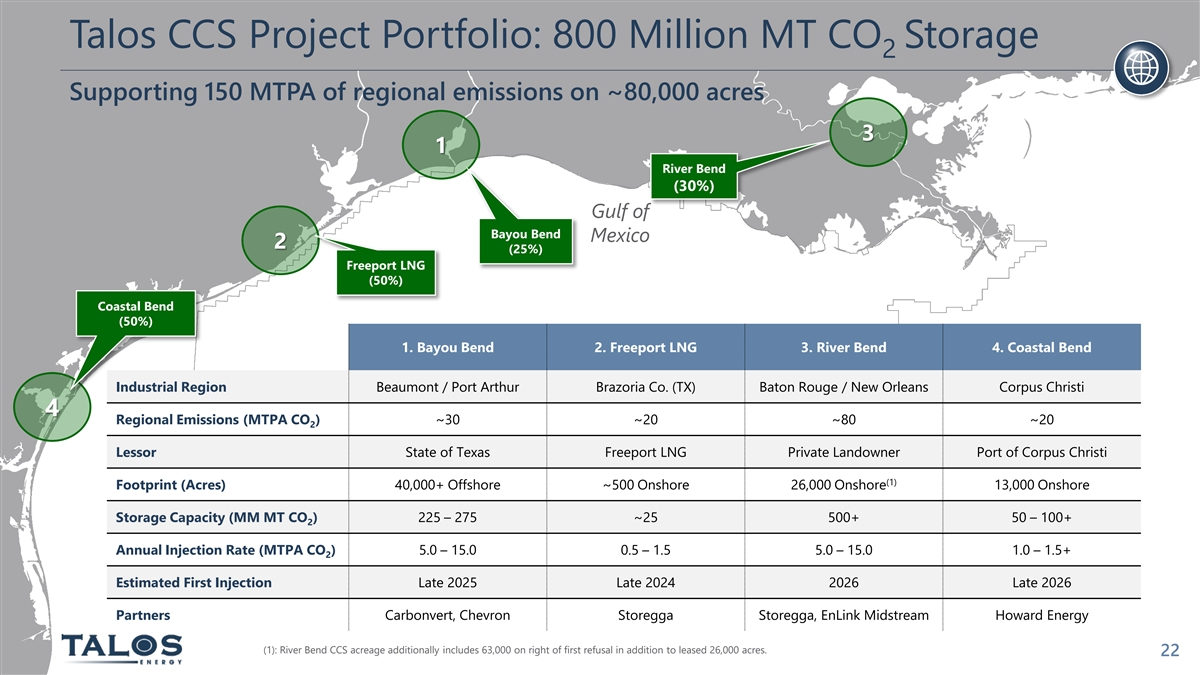 Talos CCS Project Portfolio: 800 Million MT CO Storage 2 Supporting 150 MTPA of regional emissions on ~80,000 acres 3 1 River Bend (30%) Gulf of Bayou Bend Mexico 2 (25%) Freeport LNG (50%) Coastal Bend (50%) 1. Bayou Bend 2. Freeport LNG 3. River Bend 4. Coastal Bend Industrial Region Beaumont / Port Arthur Brazoria Co. (TX) Baton Rouge / New Orleans Corpus Christi 4 Regional Emissions (MTPA CO ) ~30 ~20 ~80 ~20 2 Lessor State of Texas Freeport LNG Private Landowner Port of Corpus Christi (1) Footprint (Acres) 40,000+ Offshore ~500 Onshore 26,000 Onshore 13,000 Onshore Storage Capacity (MM MT CO ) 225 – 275 ~25 500+ 50 – 100+ 2 Annual Injection Rate (MTPA CO ) 5.0 – 15.0 0.5 – 1.5 5.0 – 15.0 1.0 – 1.5+ 2 Estimated First Injection Late 2025 Late 2024 2026 Late 2026 Partners Carbonvert, Chevron Storegga Storegga, EnLink Midstream Howard Energy (1): River Bend CCS acreage additionally includes 63,000 on right of first refusal in addition to leased 26,000 acres. 22
