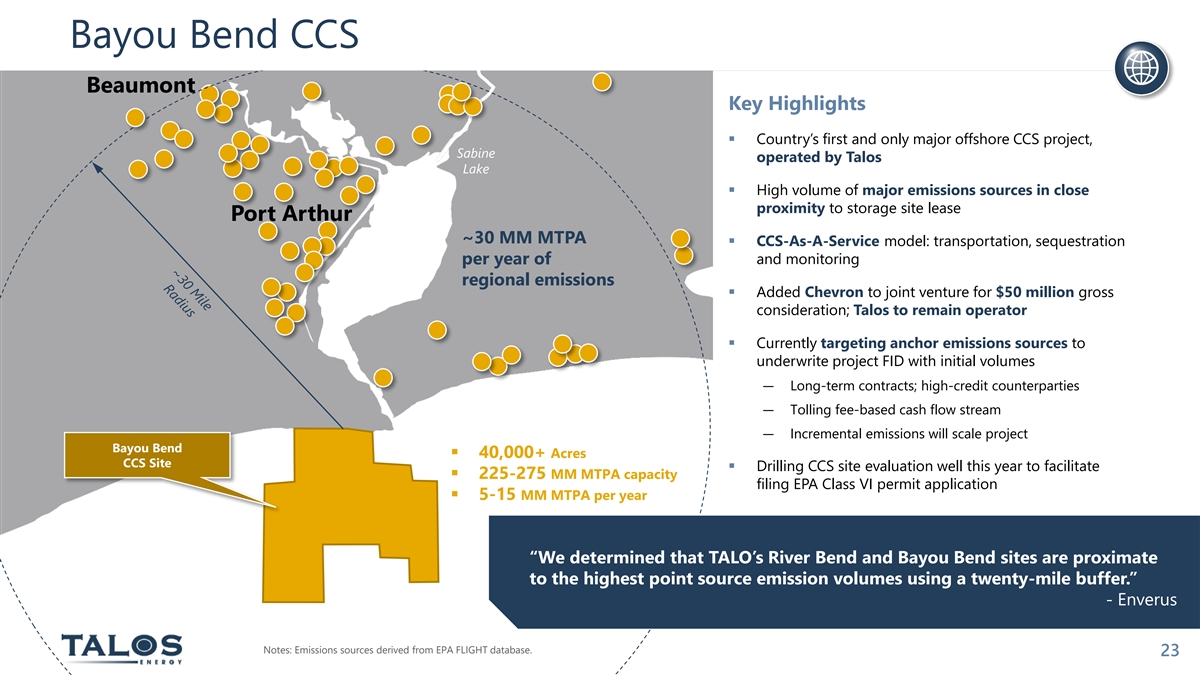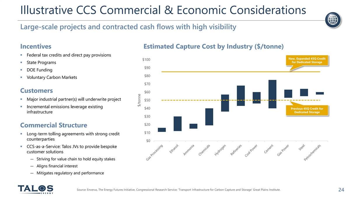 Bayou Bend CCS Beaumont Key Highlights § Country’s first and only major offshore CCS project, Sabine operated by Talos Lake § High volume of major emissions sources in close proximity to storage site lease Port Arthur ~30 MM MTPA § CCS-As-A-Service model: transportation, sequestration and monitoring per year of regional emissions § Added Chevron to joint venture for $50 million gross consideration; Talos to remain operator § Currently targeting anchor emissions sources to underwrite project FID with initial volumes ― Long-term contracts; high-credit counterparties ― Tolling fee-based cash flow stream ― Incremental emissions will scale project Bayou Bend § 40,000+ Acres CCS Site § Drilling CCS site evaluation well this year to facilitate § 225-275 MM MTPA capacity filing EPA Class VI permit application § 5-15 MM MTPA per year “We determined that TALO’s River Bend and Bayou Bend sites are proximate to the highest point source emission volumes using a twenty-mile buffer.” - Enverus Notes: Emissions sources derived from EPA FLIGHT database. 23