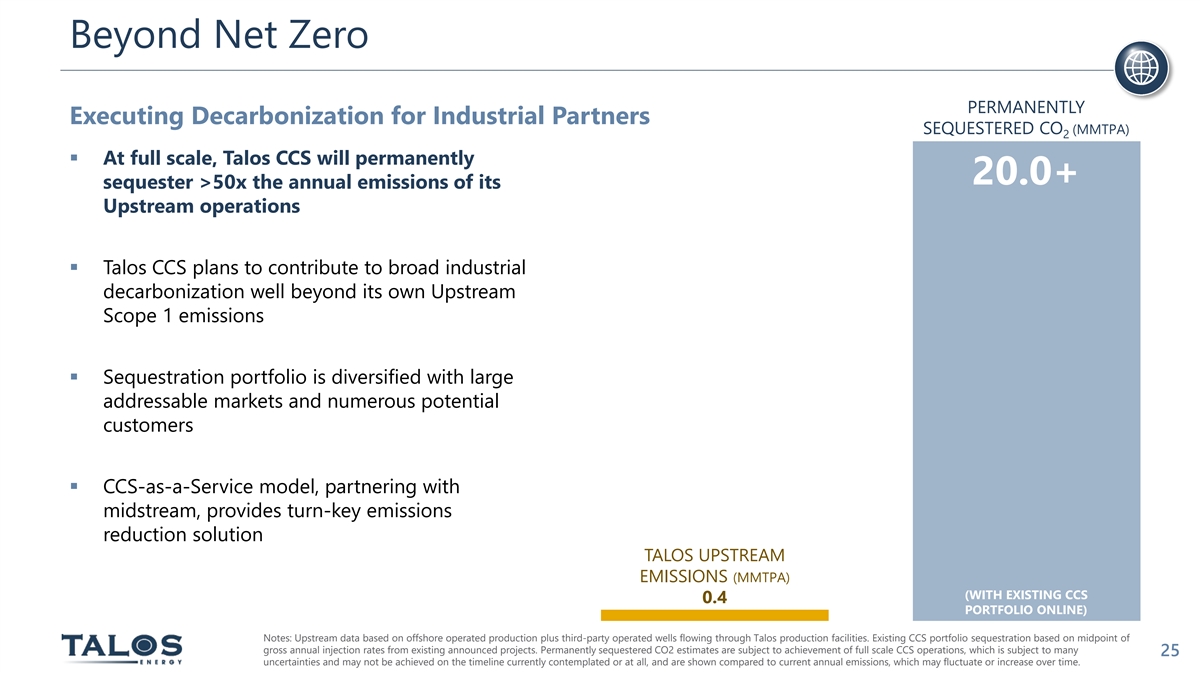 Illustrative CCS Commercial & Economic Considerations Large-scale projects and contracted cash flows with high visibility Incentives Estimated Capture Cost by Industry ($/tonne) § Federal tax credits and direct pay provisions New, Expanded 45Q Credit $100 for Dedicated Storage § State Programs $90 § DOE Funding $80 § Voluntary Carbon Markets $70 Customers $60 § Major industrial partner(s) will underwrite project $50 § Incremental emissions leverage existing $40 Previous 45Q Credit for Dedicated Storage infrastructure $30 $20 Commercial Structure $10 § Long-term tolling agreements with strong credit counterparties $0 § CCS-as-a-Service: Talos JVs to provide bespoke customer solutions ― Striving for value chain to hold equity stakes ― Aligns financial interest ― Mitigates regulatory and performance Source: Enverus, The Energy Futures Initiative, Congressional Research Service; ‘Transport Infrastructure for Carbon Capture and Storage’ Great Plains Institute. 24 $/tonne