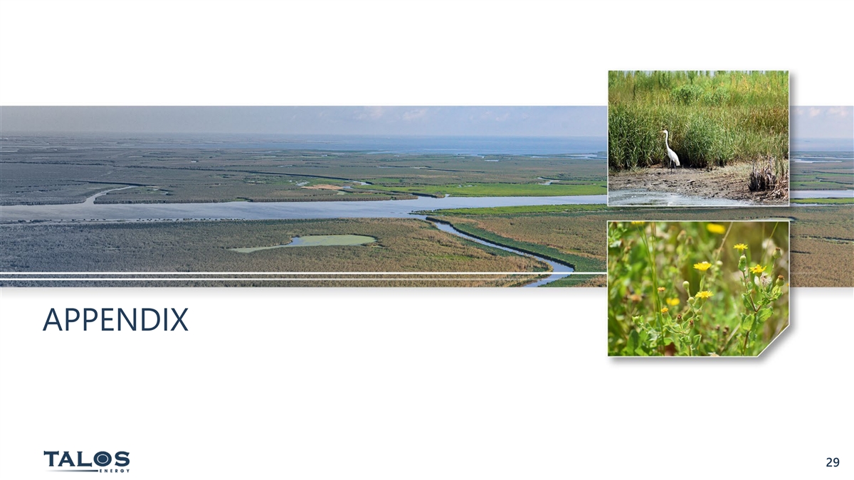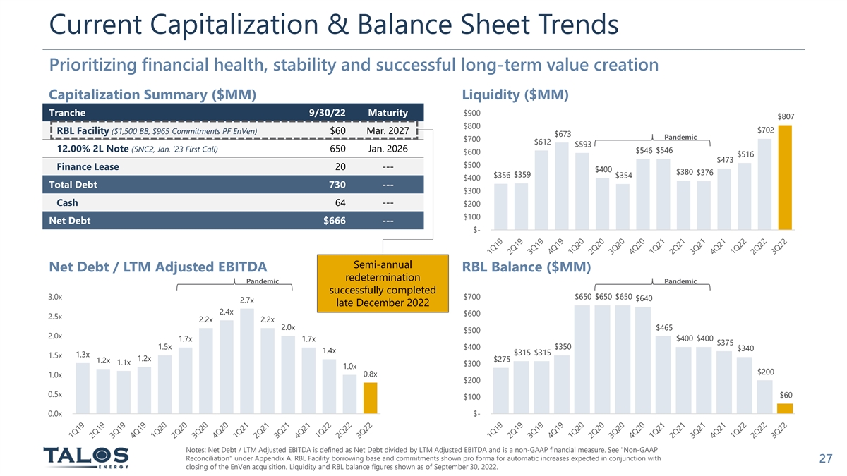 Current Capitalization & Balance Sheet Trends Prioritizing financial health, stability and successful long-term value creation Capitalization Summary ($MM) Liquidity ($MM) $900 Tranche 9/30/22 Maturity $807 $800 $702 RBL Facility ($1,500 BB, $965 Commitments PF EnVen) $60 Mar. 2027 $673 Pandemic $700 $612 $593 12.00% 2L Note (5NC2, Jan. ’23 First Call) 650 Jan. 2026 $546 $546 $600 $516 $473 $500 Finance Lease 20 --- $400 $380 $376 $359 $356 $354 $400 Total Debt 730 --- $300 Cash 64 --- $200 $100 Net Debt $666 --- $- Semi-annual Net Debt / LTM Adjusted EBITDA RBL Balance ($MM) redetermination Pandemic Pandemic successfully completed 3.0x $700 $650 $650 $650 $640 2.7x late December 2022 2.4x $600 2.5x 2.2x 2.2x 2.0x $465 $500 2.0x $400 $400 1.7x 1.7x $375 1.5x $400 $350 $340 1.4x $315 $315 1.3x 1.5x 1.2x $275 1.2x 1.1x $300 1.0x $200 0.8x 1.0x $200 0.5x $60 $100 0.0x $- Notes: Net Debt / LTM Adjusted EBITDA is defined as Net Debt divided by LTM Adjusted EBITDA and is a non-GAAP financial measure. See Non-GAAP Reconciliation under Appendix A. RBL Facility borrowing base and commitments shown pro forma for automatic increases expected in conjunction with 27 closing of the EnVen acquisition. Liquidity and RBL balance figures shown as of September 30, 2022.