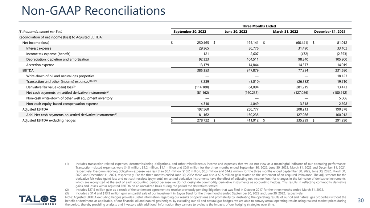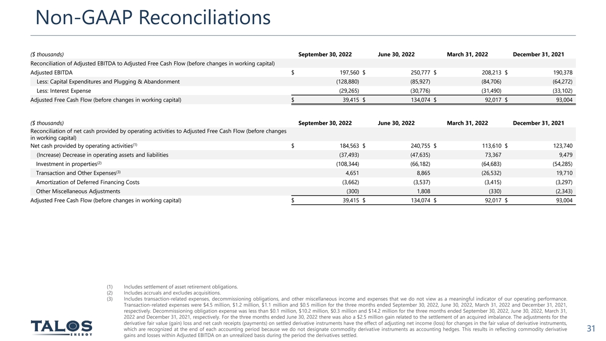 Non-GAAP Reconciliations Three Months Ended ($ thousands, except per Boe) September 30, 2022 June 30, 2022 March 31, 2022 December 31, 2021 Reconciliation of net income (loss) to Adjusted EBITDA: Net Income (loss) $ 250,465 $ 195,141 $ (66,441) $ 81,012 Interest expense 29,265 30,776 31,490 33,102 Income tax expense (benefit) 121 2,607 (472) (2,353) Depreciation, depletion and amortization 92,323 104,511 98,340 105,900 Accretion expense 13,179 14,844 14,377 14,019 EBITDA 385,353 347,879 77,294 231,680 Write-down of oil and natural gas properties — — — 18,123 (1)(3)(4) Transaction and other (income) expenses 3,239 (5,010) (26,532) 19,710 (2) Derivative fair value (gain) loss (114,180) 64,094 281,219 13,473 (2) Net cash payments on settled derivative instruments (81,162) (160,235) (127,086) (100,912) Non-cash write-down of other well equipment inventory — — — 5,606 Non-cash equity-based compensation expense 4,310 4,049 3,318 2,698 Adjusted EBITDA 197,560 250,777 208,213 190,378 (2) Add: Net cash payments on settled derivative instruments 81,162 160,235 127,086 100,912 Adjusted EBITDA excluding hedges $ 278,722 $ 411,012 $ 335,299 $ 291,290 (1) Includes transaction-related expenses, decommissioning obligations, and other miscellaneous income and expenses that we do not view as a meaningful indicator of our operating performance. Transaction-related expenses were $4.5 million, $1.2 million, $1.1 million and $0.5 million for the three months ended September 30, 2022, June 30, 2022, March 31, 2022 and December 31, 2021, respectively. Decommissioning obligation expense was less than $0.1 million, $10.2 million, $0.3 million and $14.2 million for the three months ended September 30, 2022, June 30, 2022, March 31, 2022 and December 31, 2021, respectively. For the three months ended June 30, 2022 there was also a $2.5 million gain related to the settlement of an acquired imbalance. The adjustments for the derivative fair value (gain) loss and net cash receipts (payments) on settled derivative instruments have the effect of adjusting net income (loss) for changes in the fair value of derivative instruments, which are recognized at the end of each accounting period because we do not designate commodity derivative instruments as accounting hedges. This results in reflecting commodity derivative gains and losses within Adjusted EBITDA on an unrealized basis during the period the derivatives settled. (2) Includes $27.5 million gain as a result of the settlement agreement to resolve previously pending litigation that was filed in October 2017 for the three months ended March 31, 2022. (3) Includes a $1.4 and $13.9 million gain on partial sale of our investment in Bayou Bend for the three months ended September 30, 2022 and June 30, 2022, respectively. Note: Adjusted EBITDA excluding hedges provides useful information regarding our results of operations and profitability by illustrating the operating results of our oil and natural gas properties without the benefit or detriment, as applicable, of our financial oil and natural gas hedges. By excluding our oil and natural gas hedges, we are able to convey actual operating results using realized market prices during 30 the period, thereby providing analysts and investors with additional information they can use to evaluate the impacts of our hedging strategies over time.