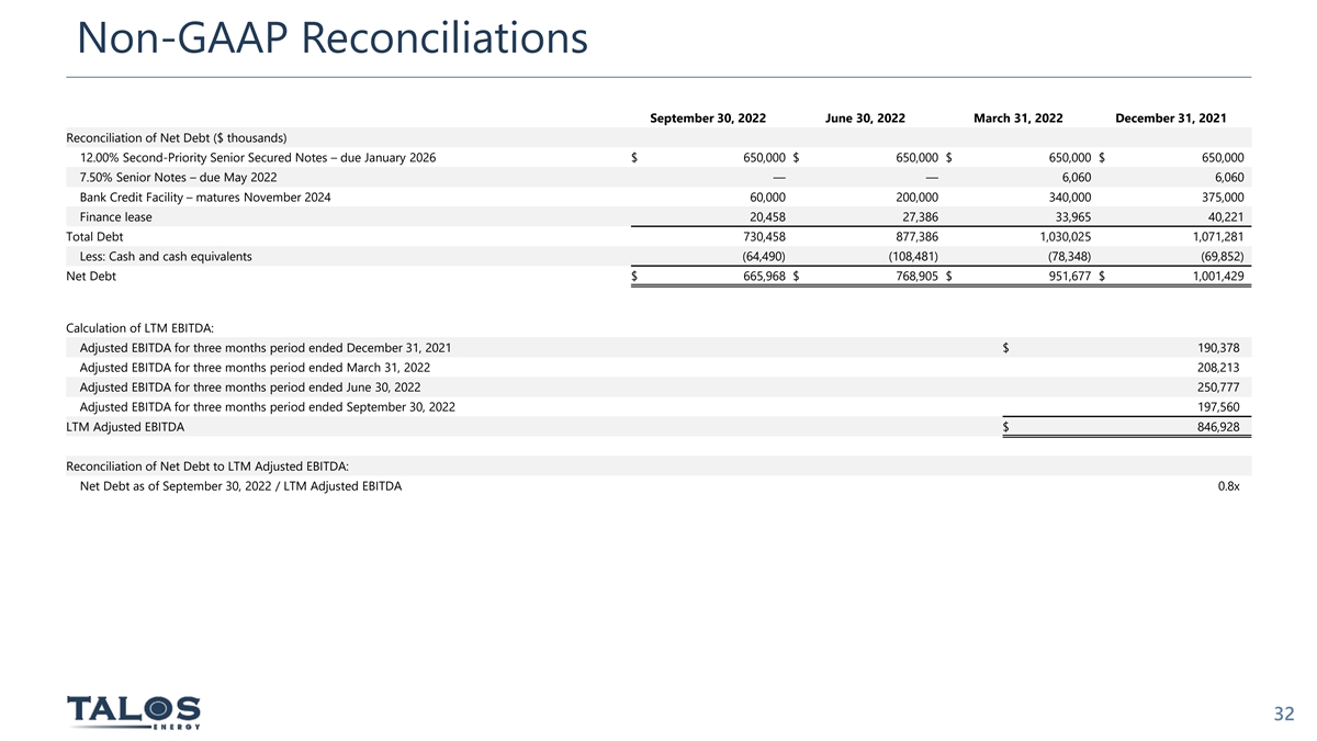 Non-GAAP Reconciliations ($ thousands) September 30, 2022 June 30, 2022 March 31, 2022 December 31, 2021 Reconciliation of Adjusted EBITDA to Adjusted Free Cash Flow (before changes in working capital) Adjusted EBITDA $ 197,560 $ 250,777 $ 208,213 $ 190,378 Less: Capital Expenditures and Plugging & Abandonment (128,880) (85,927) (84,706) (64,272) Less: Interest Expense (29,265) (30,776) (31,490) (33,102) Adjusted Free Cash Flow (before changes in working capital) $ 39,415 $ 134,074 $ 92,017 $ 93,004 ($ thousands) September 30, 2022 June 30, 2022 March 31, 2022 December 31, 2021 Reconciliation of net cash provided by operating activities to Adjusted Free Cash Flow (before changes in working capital) (1) Net cash provided by operating activities $ 184,563 $ 240,755 $ 113,610 $ 123,740 (Increase) Decrease in operating assets and liabilities (37,493) (47,635) 73,367 9,479 (2) Investment in properties (108,344) (66,182) (64,683) (54,285) (3) Transaction and Other Expenses 4,651 8,865 (26,532) 19,710 Amortization of Deferred Financing Costs (3,662) (3,537) (3,415) (3,297) Other Miscellaneous Adjustments (300) 1,808 (330) (2,343) Adjusted Free Cash Flow (before changes in working capital) $ 39,415 $ 134,074 $ 92,017 $ 93,004 (1) Includes settlement of asset retirement obligations. (2) Includes accruals and excludes acquisitions. (3) Includes transaction-related expenses, decommissioning obligations, and other miscellaneous income and expenses that we do not view as a meaningful indicator of our operating performance. Transaction-related expenses were $4.5 million, $1.2 million, $1.1 million and $0.5 million for the three months ended September 30, 2022, June 30, 2022, March 31, 2022 and December 31, 2021, respectively. Decommissioning obligation expense was less than $0.1 million, $10.2 million, $0.3 million and $14.2 million for the three months ended September 30, 2022, June 30, 2022, March 31, 2022 and December 31, 2021, respectively. For the three months ended June 30, 2022 there was also a $2.5 million gain related to the settlement of an acquired imbalance. The adjustments for the derivative fair value (gain) loss and net cash receipts (payments) on settled derivative instruments have the effect of adjusting net income (loss) for changes in the fair value of derivative instruments, which are recognized at the end of each accounting period because we do not designate commodity derivative instruments as accounting hedges. This results in reflecting commodity derivative 31 gains and losses within Adjusted EBITDA on an unrealized basis during the period the derivatives settled.