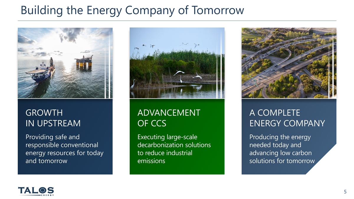 Who We Are Talos Energy is an innovative, § Conventional offshore focus industry-leading energy company focused on Exploration & Production § Carbon capture leadership and Carbon Capture & Sequestration. We are committed to leveraging § Strong cash flow generation profile our technical, operational and commercial expertise to help supply § Solid balance sheet society’s growing need for secure, affordable energy and leading industrial decarbonization efforts § Exploration catalysts for the future while building value for all of our stakeholders. § Natural acquiror 4