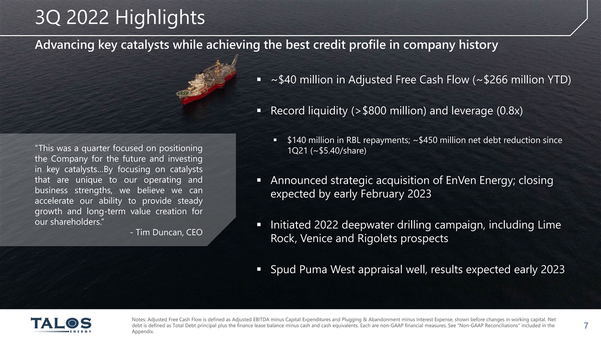 3Q 2022 Highlights Advancing key catalysts while achieving the best credit profile in company history § ~$40 million in Adjusted Free Cash Flow (~$266 million YTD) § Record liquidity (>$800 million) and leverage (0.8x) § $140 million in RBL repayments; ~$450 million net debt reduction since “This was a quarter focused on positioning 1Q21 (~$5.40/share) the Company for the future and investing in key catalysts…By focusing on catalysts that are unique to our operating and § Announced strategic acquisition of EnVen Energy; closing business strengths, we believe we can expected by early February 2023 accelerate our ability to provide steady growth and long-term value creation for our shareholders.” § Initiated 2022 deepwater drilling campaign, including Lime - Tim Duncan, CEO Rock, Venice and Rigolets prospects § Spud Puma West appraisal well, results expected early 2023 Notes: Adjusted Free Cash Flow is defined as Adjusted EBITDA minus Capital Expenditures and Plugging & Abandonment minus Interest Expense, shown before changes in working capital. Net debt is defined as Total Debt principal plus the finance lease balance minus cash and cash equivalents. Each are non-GAAP financial measures. See Non-GAAP Reconciliations included in the 7 Appendix.
