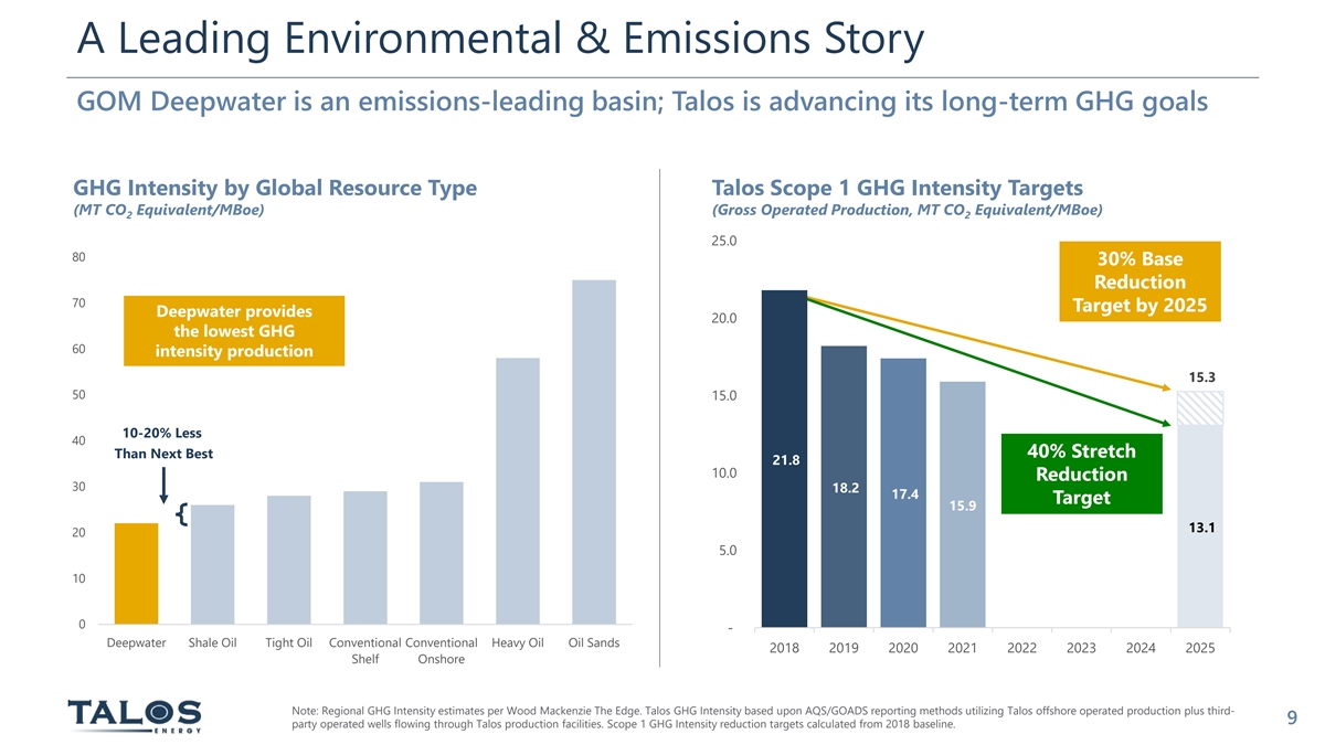 The Gulf of Mexico – A Significant National Resource One of the largest, most diverse and most prolific basins on Earth Top U.S. Basins by Daily Oil Production Large-Scale Operations from Majors, Independents, Privates 4,500 500 4,000 450 3,500 Second largest oil-producing 400 basin in the United States 350 3,000 300 2,500 250 2,000 200 1,500 150 1,000 100 500 50 - - Permian U.S. Gulf of Bakken Eagle Ford Niobrara Mississippi / Mexico Woodford ~60 ~50% #8 ~2/3 PLATFORMS OF U.S. REFINING CAPACITY TALOS IS A OF BASIN PRODUCTION >1,000’ DEPTH ALONG GULF COAST TOP 10 PRODUCER FROM TOP 4 COMPANIES Note: Basin oil production as of March 1, 2022 per EIA. 2021 production data per Enverus and excludes eight additional operators with production under 35 MBoe/d. 8 Current Oil Production (MBbl/d) 2021 Daily Gross Production (MBoe/d)