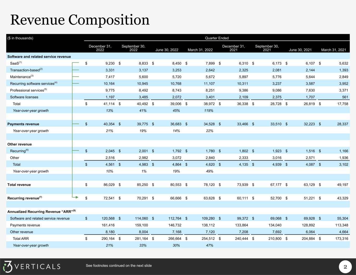2 Revenue Composition ($ in thousands) Quarter Ended December 31, 2022 September 30, 2022 June 30, 2022 March 31, 2022 December 31, 2021 September 30, 2021 June 30, 2021 March 31, 2021 Software and related service revenue SaaS(1) $ 9,230 $ 8,833 $ 8,450 $ 7,899 $ 6,310 $ 6,173 $ 6,107 $ 5,632 Transaction-based(2) 3,331 3,137 3,253 2,642 2,325 2,081 2,144 1,393 Maintenance(3) 7,417 5,600 5,720 5,672 5,897 5,776 5,644 2,849 Recurring software services(4) 10,164 10,945 10,768 11,107 10,311 3,237 3,587 3,952 Professional services(5) 9,775 8,492 8,743 8,251 9,386 9,086 7,630 3,371 Software licenses 1,197 3,485 2,072 3,401 2,109 2,375 1,707 561 Total $ 41,114 $ 40,492 $ 39,006 $ 38,972 $ 36,338 $ 28,728 $ 26,819 $ 17,758 Year-over-year growth 13 % 41 % 45 % 119 % Payments revenue $ 40,354 $ 39,775 $ 36,683 $ 34,528 $ 33,466 $ 33,510 $ 32,223 $ 28,337 Year-over-year growth 21 % 19 % 14 % 22 % Other revenue Recurring(6) $ 2,045 $ 2,001 $ 1,792 $ 1,780 $ 1,802 $ 1,923 $ 1,516 $ 1,166 Other 2,516 2,982 3,072 2,840 2,333 3,016 2,571 1,936 Total $ 4,561 $ 4,983 $ 4,864 $ 4,620 $ 4,135 $ 4,939 $ 4,087 $ 3,102 Year-over-year growth 10 % 1 % 19 % 49 % Total revenue $ 86,029 $ 85,250 $ 80,553 $ 78,120 $ 73,939 $ 67,177 $ 63,129 $ 49,197 Recurring revenue(7) $ 72,541 $ 70,291 $ 66,666 $ 63,628 $ 60,111 $ 52,700 $ 51,221 $ 43,329 Annualized Recurring Revenue “ARR”(8) Software and related service revenue $ 120,568 $ 114,060 $ 112,764 $ 109,280 $ 99,372 $ 69,068 $ 69,928 $ 55,304 Payments revenue 161,416 159,100 146,732 138,112 133,864 134,040 128,892 113,348 Other revenue 8,180 8,004 7,168 7,120 7,208 7,692 6,064 4,664 Total ARR $ 290,164 $ 281,164 $ 266,664 $ 254,512 $ 240,444 $ 210,800 $ 204,884 $ 173,316 Year-over-year growth 21 % 33 % 30 % 47 % See footnotes continued on the next slide