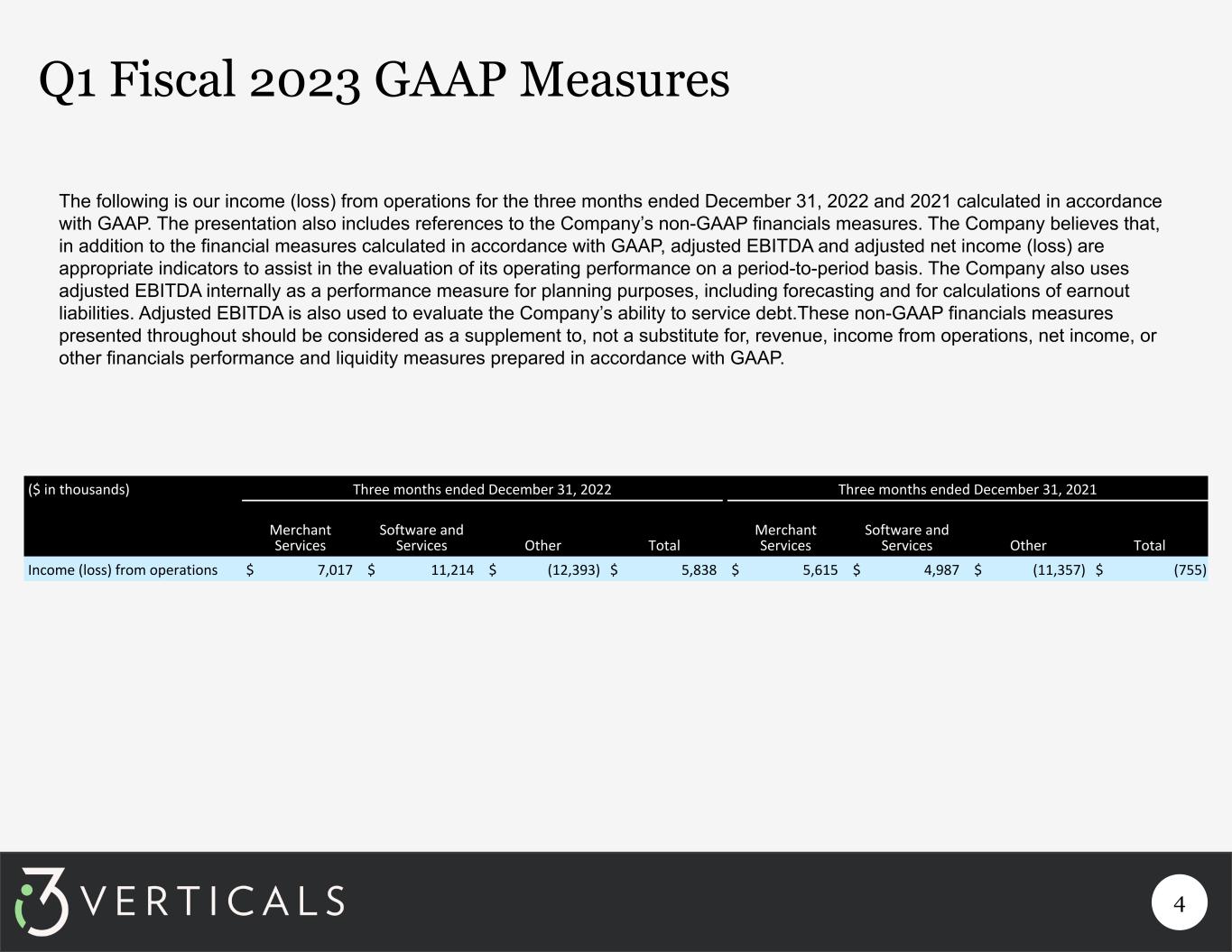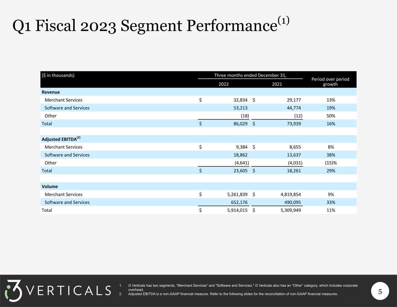 4 Q1 Fiscal 2023 GAAP Measures ($ in thousands) Three months ended December 31, 2022 Three months ended December 31, 2021 Merchant Services Software and Services Other Total Merchant Services Software and Services Other Total Income (loss) from operations $ 7,017 $ 11,214 $ (12,393) $ 5,838 $ 5,615 $ 4,987 $ (11,357) $ (755) The following is our income (loss) from operations for the three months ended December 31, 2022 and 2021 calculated in accordance with GAAP. The presentation also includes references to the Company’s non-GAAP financials measures. The Company believes that, in addition to the financial measures calculated in accordance with GAAP, adjusted EBITDA and adjusted net income (loss) are appropriate indicators to assist in the evaluation of its operating performance on a period-to-period basis. The Company also uses adjusted EBITDA internally as a performance measure for planning purposes, including forecasting and for calculations of earnout liabilities. Adjusted EBITDA is also used to evaluate the Company’s ability to service debt.These non-GAAP financials measures presented throughout should be considered as a supplement to, not a substitute for, revenue, income from operations, net income, or other financials performance and liquidity measures prepared in accordance with GAAP.