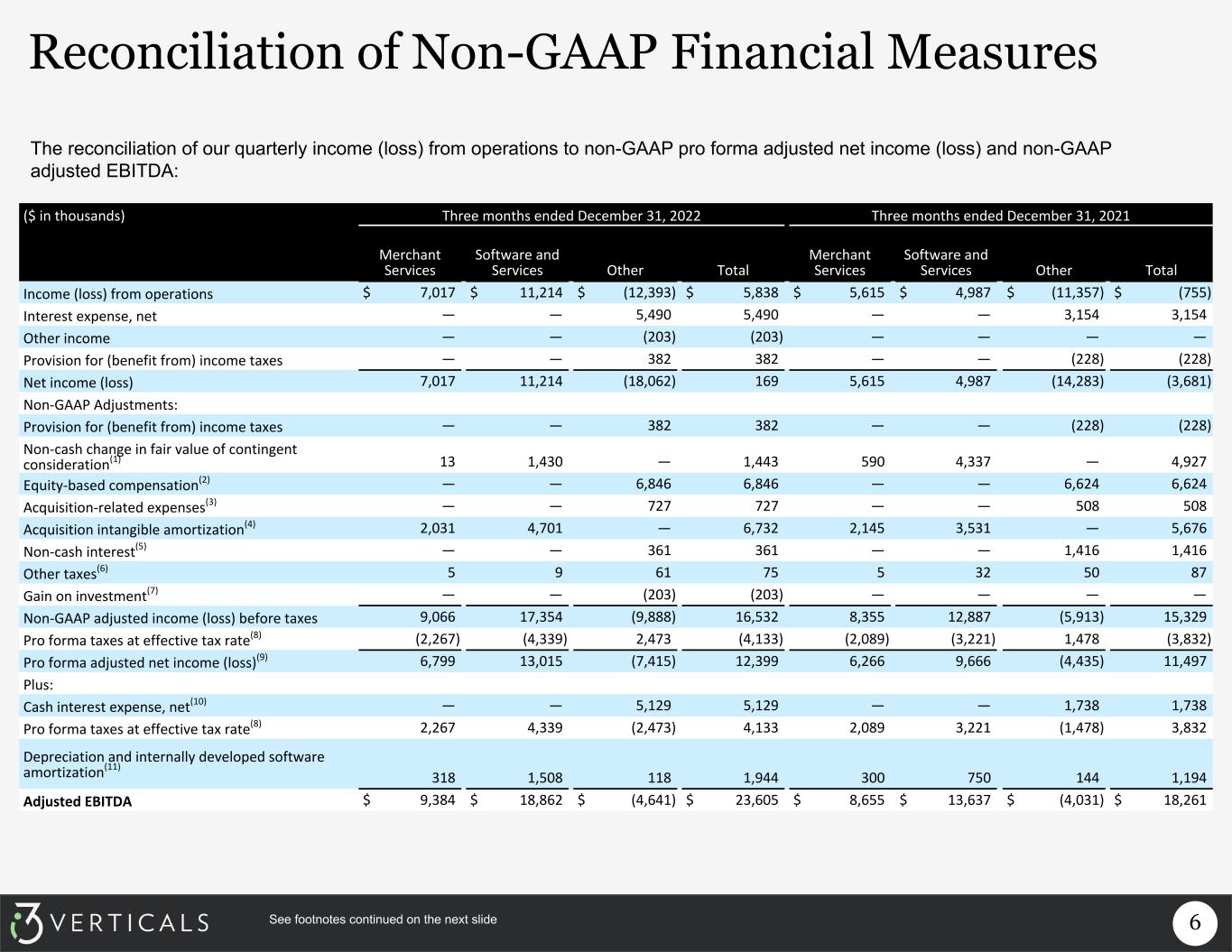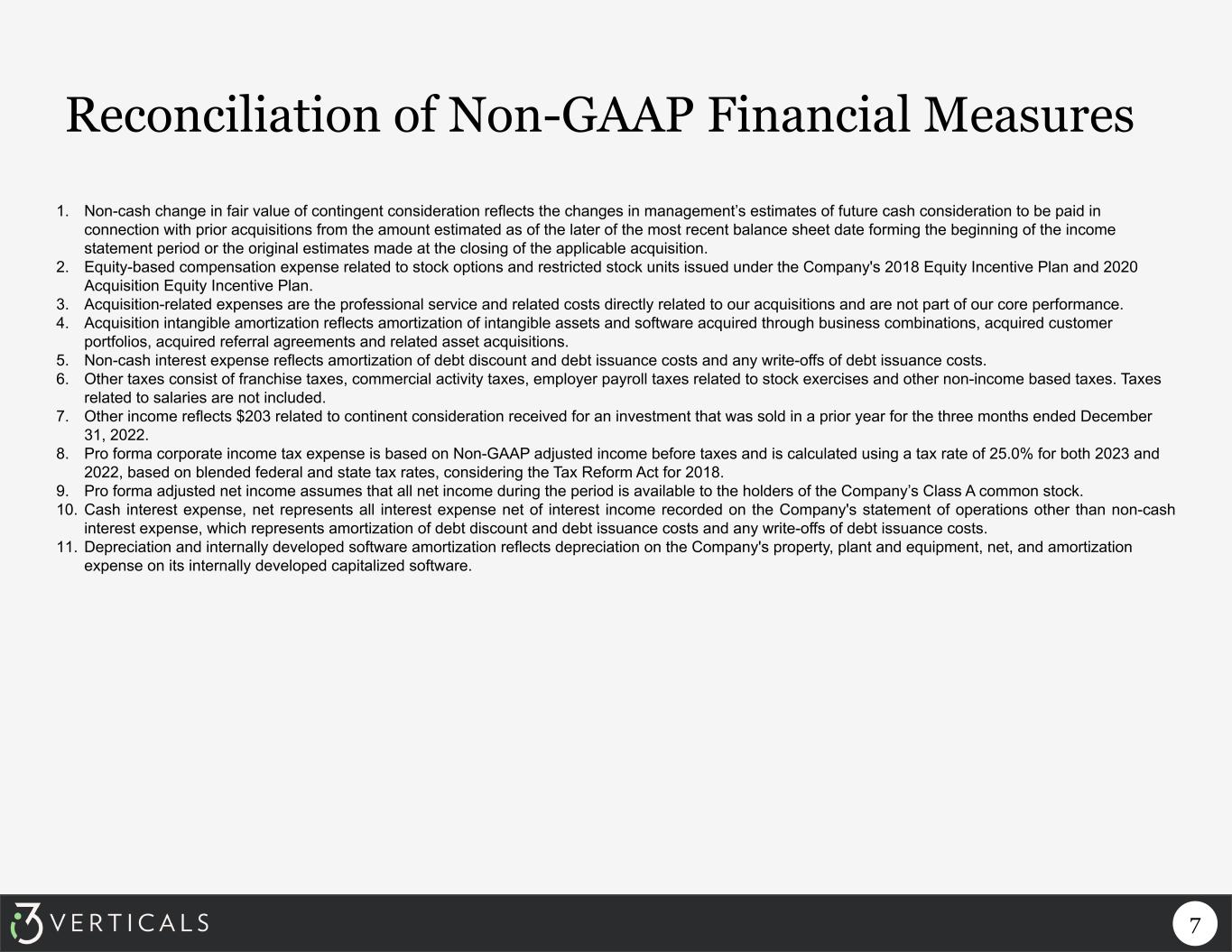 6 ($ in thousands) Three months ended December 31, 2022 Three months ended December 31, 2021 Merchant Services Software and Services Other Total Merchant Services Software and Services Other Total Income (loss) from operations $ 7,017 $ 11,214 $ (12,393) $ 5,838 $ 5,615 $ 4,987 $ (11,357) $ (755) Interest expense, net — — 5,490 5,490 — — 3,154 3,154 Other income — — (203) (203) — — — — Provision for (benefit from) income taxes — — 382 382 — — (228) (228) Net income (loss) 7,017 11,214 (18,062) 169 5,615 4,987 (14,283) (3,681) Non-GAAP Adjustments: Provision for (benefit from) income taxes — — 382 382 — — (228) (228) Non-cash change in fair value of contingent consideration(1) 13 1,430 — 1,443 590 4,337 — 4,927 Equity-based compensation(2) — — 6,846 6,846 — — 6,624 6,624 Acquisition-related expenses(3) — — 727 727 — — 508 508 Acquisition intangible amortization(4) 2,031 4,701 — 6,732 2,145 3,531 — 5,676 Non-cash interest(5) — — 361 361 — — 1,416 1,416 Other taxes(6) 5 9 61 75 5 32 50 87 Gain on investment(7) — — (203) (203) — — — — Non-GAAP adjusted income (loss) before taxes 9,066 17,354 (9,888) 16,532 8,355 12,887 (5,913) 15,329 Pro forma taxes at effective tax rate(8) (2,267) (4,339) 2,473 (4,133) (2,089) (3,221) 1,478 (3,832) Pro forma adjusted net income (loss)(9) 6,799 13,015 (7,415) 12,399 6,266 9,666 (4,435) 11,497 Plus: Cash interest expense, net(10) — — 5,129 5,129 — — 1,738 1,738 Pro forma taxes at effective tax rate(8) 2,267 4,339 (2,473) 4,133 2,089 3,221 (1,478) 3,832 Depreciation and internally developed software amortization(11) 318 1,508 118 1,944 300 750 144 1,194 Adjusted EBITDA $ 9,384 $ 18,862 $ (4,641) $ 23,605 $ 8,655 $ 13,637 $ (4,031) $ 18,261 See footnotes continued on the next slide The reconciliation of our quarterly income (loss) from operations to non-GAAP pro forma adjusted net income (loss) and non-GAAP adjusted EBITDA: Reconciliation of Non-GAAP Financial Measures