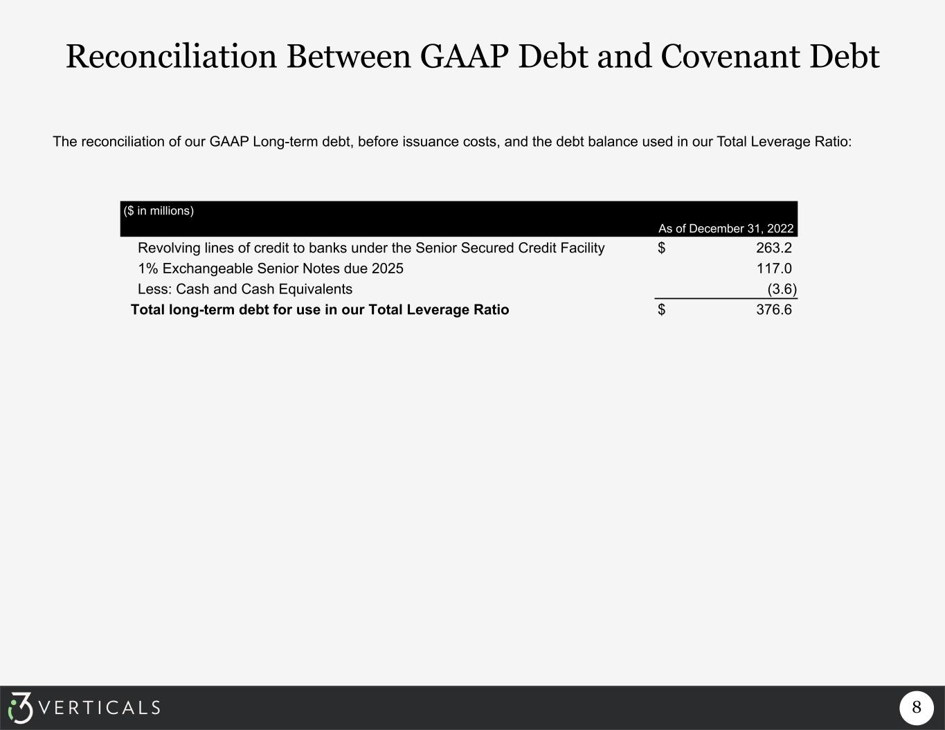 8 Reconciliation Between GAAP Debt and Covenant Debt ($ in millions) As of December 31, 2022 Revolving lines of credit to banks under the Senior Secured Credit Facility $ 263.2 1% Exchangeable Senior Notes due 2025 117.0 Less: Cash and Cash Equivalents (3.6) Total long-term debt for use in our Total Leverage Ratio $ 376.6 The reconciliation of our GAAP Long-term debt, before issuance costs, and the debt balance used in our Total Leverage Ratio: