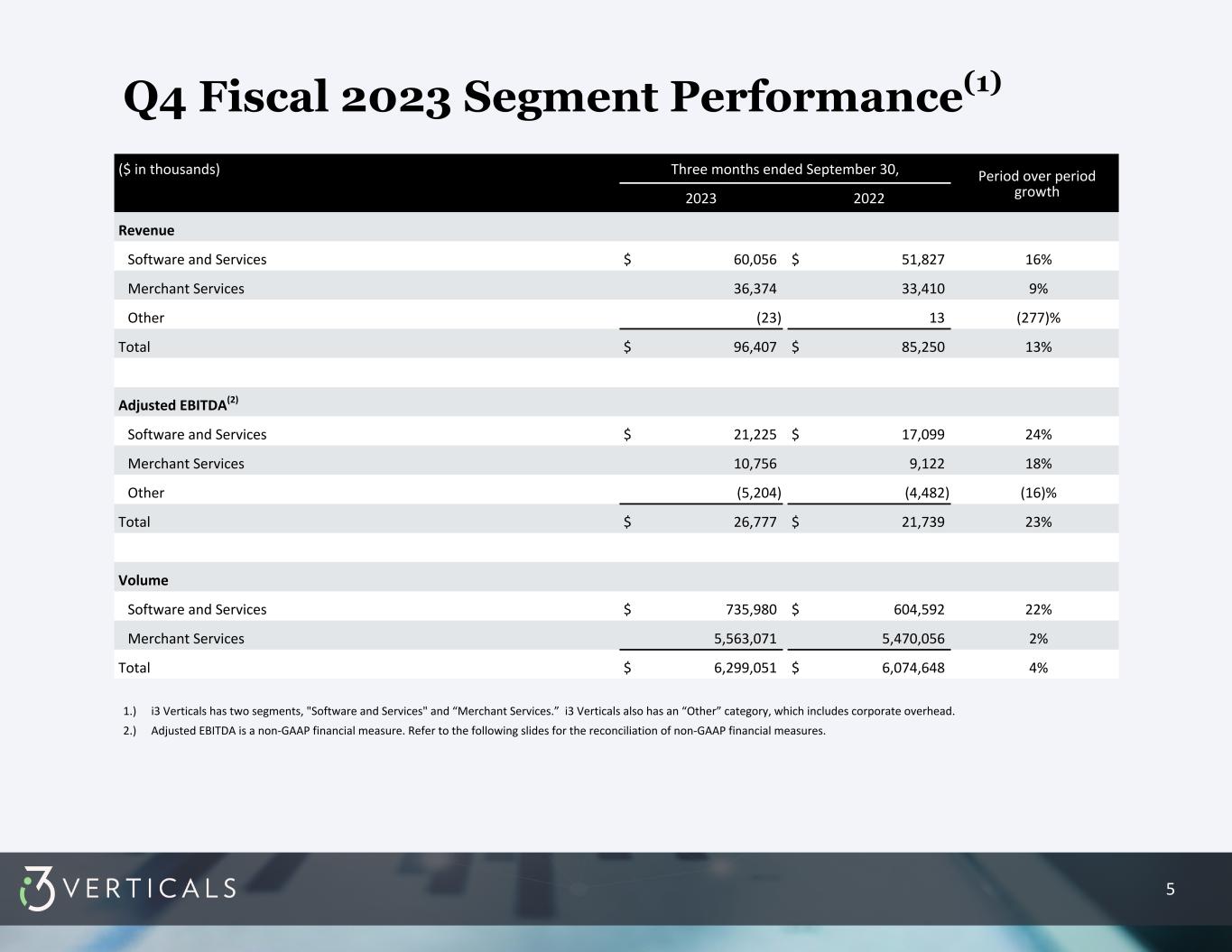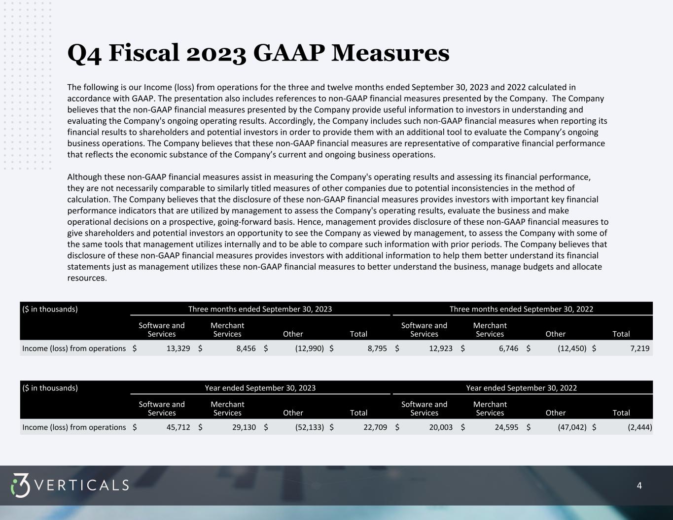 4 ($ in thousands) Three months ended September 30, 2023 Three months ended September 30, 2022 Software and Services Merchant Services Other Total Software and Services Merchant Services Other Total Income (loss) from operations $ 13,329 $ 8,456 $ (12,990) $ 8,795 $ 12,923 $ 6,746 $ (12,450) $ 7,219 ($ in thousands) Year ended September 30, 2023 Year ended September 30, 2022 Software and Services Merchant Services Other Total Software and Services Merchant Services Other Total Income (loss) from operations $ 45,712 $ 29,130 $ (52,133) $ 22,709 $ 20,003 $ 24,595 $ (47,042) $ (2,444) The following is our Income (loss) from operations for the three and twelve months ended September 30, 2023 and 2022 calculated in accordance with GAAP. The presentation also includes references to non-GAAP financial measures presented by the Company. The Company believes that the non-GAAP financial measures presented by the Company provide useful information to investors in understanding and evaluating the Company's ongoing operating results. Accordingly, the Company includes such non-GAAP financial measures when reporting its financial results to shareholders and potential investors in order to provide them with an additional tool to evaluate the Company’s ongoing business operations. The Company believes that these non-GAAP financial measures are representative of comparative financial performance that reflects the economic substance of the Company’s current and ongoing business operations. Although these non-GAAP financial measures assist in measuring the Company's operating results and assessing its financial performance, they are not necessarily comparable to similarly titled measures of other companies due to potential inconsistencies in the method of calculation. The Company believes that the disclosure of these non-GAAP financial measures provides investors with important key financial performance indicators that are utilized by management to assess the Company's operating results, evaluate the business and make operational decisions on a prospective, going-forward basis. Hence, management provides disclosure of these non-GAAP financial measures to give shareholders and potential investors an opportunity to see the Company as viewed by management, to assess the Company with some of the same tools that management utilizes internally and to be able to compare such information with prior periods. The Company believes that disclosure of these non-GAAP financial measures provides investors with additional information to help them better understand its financial statements just as management utilizes these non-GAAP financial measures to better understand the business, manage budgets and allocate resources. Q4 Fiscal 2023 GAAP Measures
