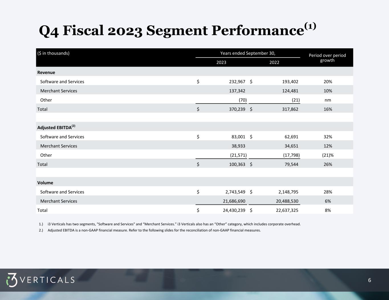 5 Q4 Fiscal 2023 Segment Performance(1) ($ in thousands) Three months ended September 30, Period over period growth2023 2022 Revenue Software and Services $ 60,056 $ 51,827 16% Merchant Services 36,374 33,410 9% Other (23) 13 (277)% Total $ 96,407 $ 85,250 13% Adjusted EBITDA(2) Software and Services $ 21,225 $ 17,099 24% Merchant Services 10,756 9,122 18% Other (5,204) (4,482) (16)% Total $ 26,777 $ 21,739 23% Volume Software and Services $ 735,980 $ 604,592 22% Merchant Services 5,563,071 5,470,056 2% Total $ 6,299,051 $ 6,074,648 4% 1.) i3 Verticals has two segments, "Software and Services" and “Merchant Services.” i3 Verticals also has an “Other” category, which includes corporate overhead. 2.) Adjusted EBITDA is a non-GAAP financial measure. Refer to the following slides for the reconciliation of non-GAAP financial measures.