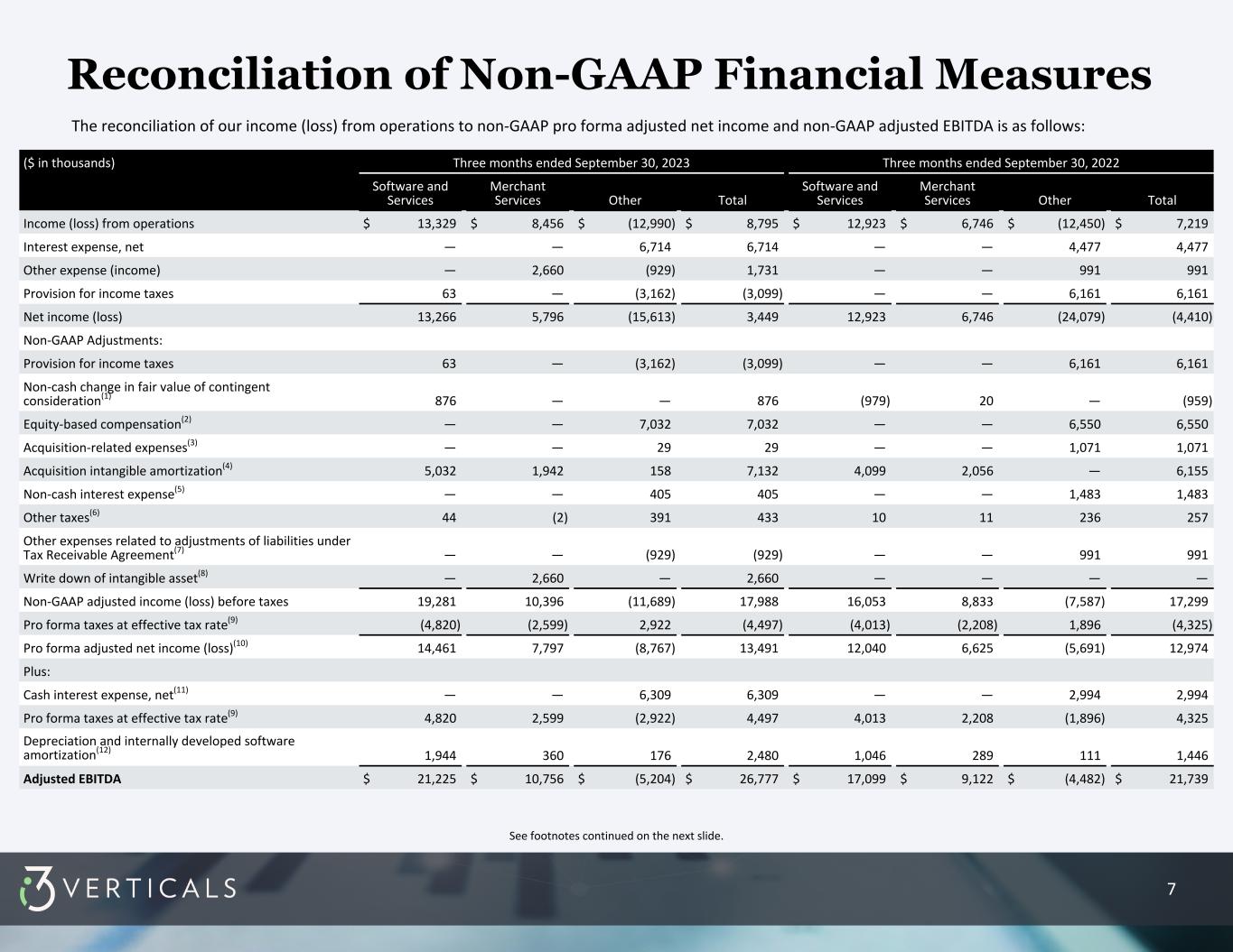 9 ($ in thousands) Year ended September 30, 2023 Year ended September 30, 2022 Software and Services Merchant Services Other Total Software and Services Merchant Services Other Total Income (loss) from operations $ 45,712 $ 29,130 $ (52,133) $ 22,709 $ 20,003 $ 24,595 $ (47,042) $ (2,444) Interest expense, net — — 25,128 25,128 — — 14,775 14,775 Other expense (income) — 2,660 (1,224) 1,436 — — 991 991 Provision for income taxes 82 — (1,285) (1,203) — — 5,007 5,007 Net income (loss) 45,630 26,470 (74,752) (2,652) 20,003 24,595 (67,815) (23,217) Non-GAAP Adjustments: Provision for income taxes 82 — (1,285) (1,203) — — 5,007 5,007 Financing-related expenses(1) — — 8 8 — — 13 13 Non-cash change in fair value of contingent consideration(2) 10,768 13 — 10,781 23,205 520 — 23,725 Equity-based compensation(3) — — 27,878 27,878 — — 26,230 26,230 Acquisition-related expenses(4) — — 1,132 1,132 — — 2,088 2,088 Acquisition intangible amortization(5) 20,051 7,933 158 28,142 15,796 8,333 — 24,129 Non-cash interest expense(6) — — 1,717 1,717 — — 5,795 5,795 Other taxes(7) 108 494 792 1,394 55 27 426 508 Other expenses related to adjustments of liabilities under Tax Receivable Agreement(8) — — (929) (929) — — 991 991 Write down of intangible asset(9) — 2,660 — 2,660 — — — — Net gain on sale of investments(10) — — (295) (295) — — — — Non-GAAP adjusted income (loss) before taxes 76,639 37,570 (45,576) 68,633 59,059 33,475 (27,265) 65,269 Pro forma taxes at effective tax rate(11) (19,160) (9,393) 11,395 (17,158) (14,765) (8,369) 6,816 (16,318) Pro forma adjusted net income (loss)(12) 57,479 28,177 (34,181) 51,475 44,294 25,106 (20,449) 48,951 Plus: Cash interest expense, net(13) — — 23,411 23,411 — — 8,980 8,980 Pro forma taxes at effective tax rate(11) 19,160 9,393 (11,395) 17,158 14,765 8,369 (6,816) 16,318 Depreciation and internally developed software amortization(14) 6,362 1,363 594 8,319 3,632 1,176 487 5,295 Adjusted EBITDA $ 83,001 $ 38,933 $ (21,571) $ 100,363 $ 62,691 $ 34,651 $ (17,798) $ 79,544 The reconciliation of our income (loss) from operations to non-GAAP pro forma adjusted net income and non-GAAP adjusted EBITDA is as follows: Reconciliation of Non-GAAP Financial Measures See footnotes continued on the next slide.