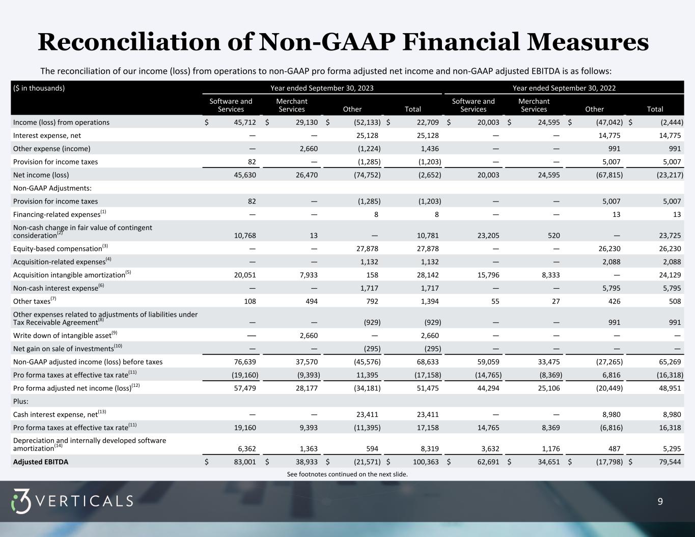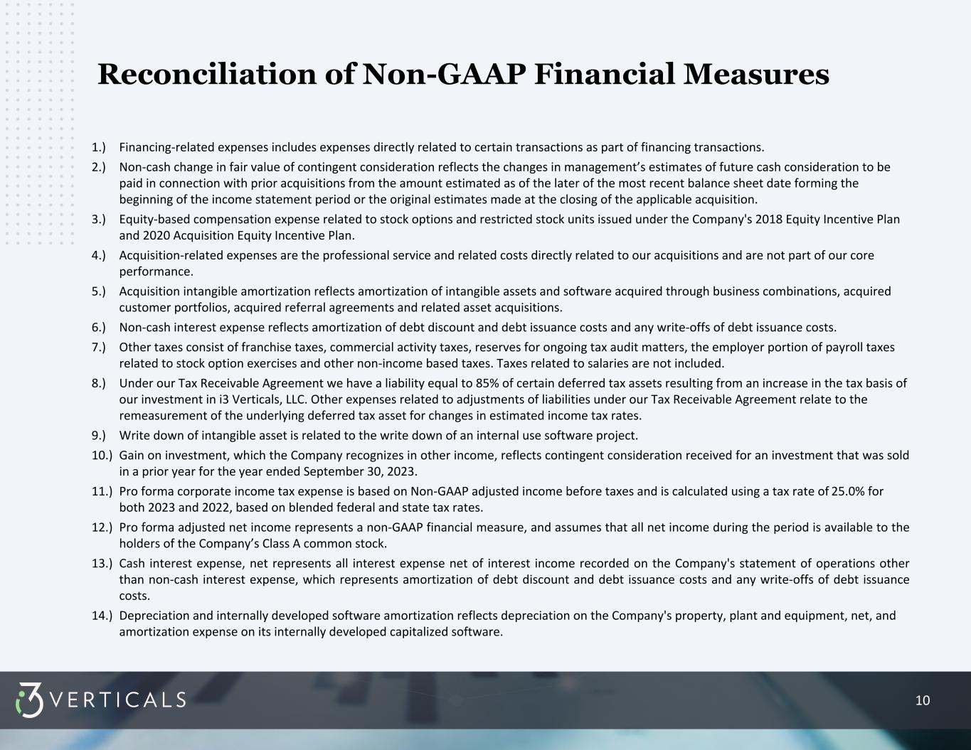 8 Reconciliation of Non-GAAP Financial Measures 1.) Non-cash change in fair value of contingent consideration reflects the changes in management’s estimates of future cash consideration to be paid in connection with prior acquisitions from the amount estimated as of the later of the most recent balance sheet date forming the beginning of the income statement period or the original estimates made at the closing of the applicable acquisition. 2.) Equity-based compensation expense related to stock options and restricted stock units issued under the Company's 2018 Equity Incentive Plan and 2020 Acquisition Equity Incentive Plan. 3.) Acquisition-related expenses are the professional service and related costs directly related to our acquisitions and are not part of our core performance. 4.) Acquisition intangible amortization reflects amortization of intangible assets and software acquired through business combinations, acquired customer portfolios, acquired referral agreements and related asset acquisitions. 5.) Non-cash interest expense reflects amortization of debt discount and debt issuance costs and any write-offs of debt issuance costs. 6.) Other taxes consist of franchise taxes, commercial activity taxes, the employer portion of payroll taxes related to stock option exercises and other non-income based taxes. Taxes related to salaries are not included. 7.) Under our Tax Receivable Agreement we have a liability equal to 85% of certain deferred tax assets resulting from an increase in the tax basis of our investment in i3 Verticals, LLC. Other expenses related to adjustments of liabilities under our Tax Receivable Agreement relate to the remeasurement of the underlying deferred tax asset for changes in estimated income tax rates. 8.) Write down of intangible asset is related to the write down of an internal use software project. 9.) Pro forma corporate income tax expense is based on Non-GAAP adjusted income before taxes and is calculated using a tax rate of 25.0% for both 2023 and 2022, based on blended federal and state tax rates. 10.) Pro forma adjusted net income represents a non-GAAP financial measure, and assumes that all net income during the period is available to the holders of the Company’s Class A common stock. 11.) Cash interest expense, net represents all interest expense net of interest income recorded on the Company's statement of operations other than non-cash interest expense, which represents amortization of debt discount and debt issuance costs and any write-offs of debt issuance costs. 12.) Depreciation and internally developed software amortization reflects depreciation on the Company's property, plant and equipment, net, and amortization expense on its internally developed capitalized software.