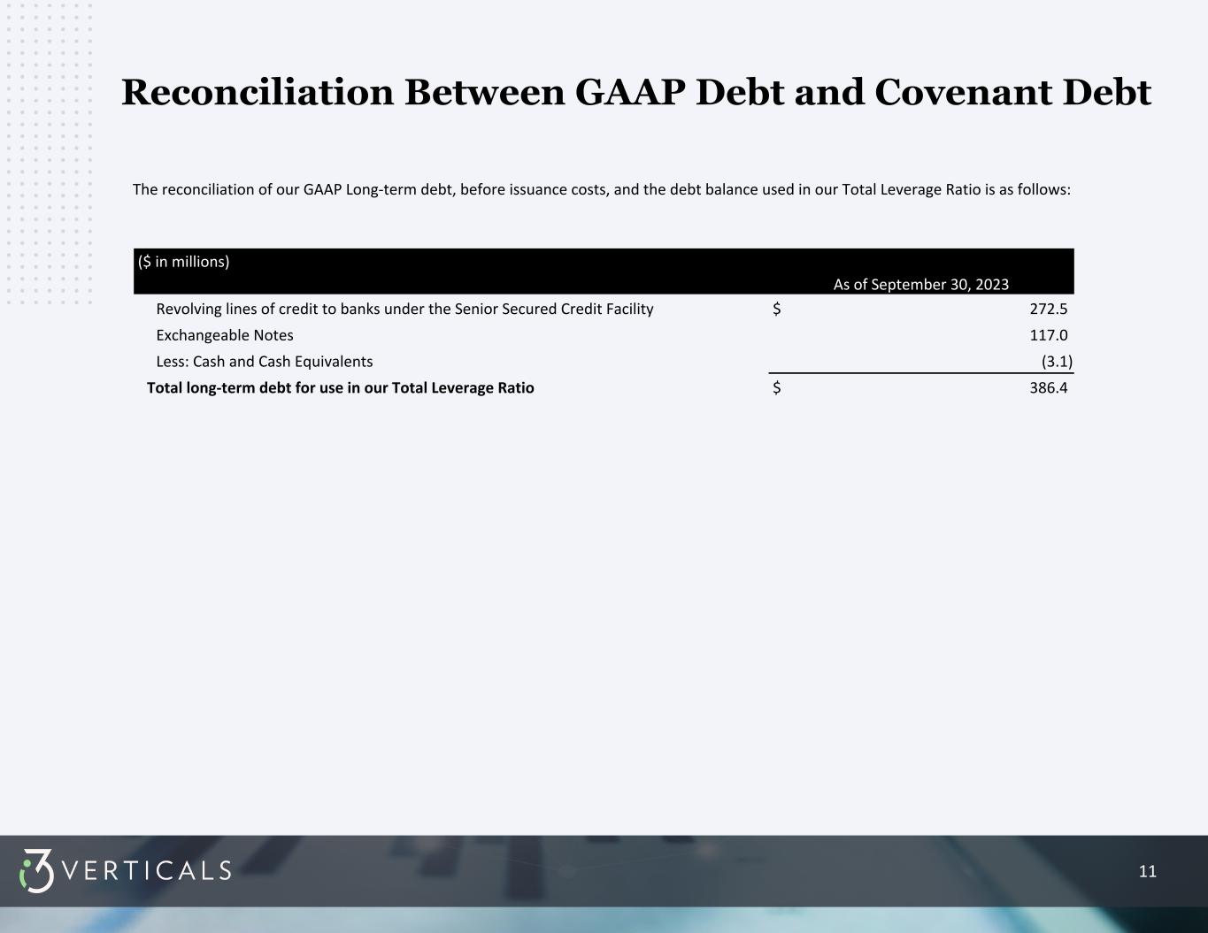 10 Reconciliation of Non-GAAP Financial Measures 1.) Financing-related expenses includes expenses directly related to certain transactions as part of financing transactions. 2.) Non-cash change in fair value of contingent consideration reflects the changes in management’s estimates of future cash consideration to be paid in connection with prior acquisitions from the amount estimated as of the later of the most recent balance sheet date forming the beginning of the income statement period or the original estimates made at the closing of the applicable acquisition. 3.) Equity-based compensation expense related to stock options and restricted stock units issued under the Company's 2018 Equity Incentive Plan and 2020 Acquisition Equity Incentive Plan. 4.) Acquisition-related expenses are the professional service and related costs directly related to our acquisitions and are not part of our core performance. 5.) Acquisition intangible amortization reflects amortization of intangible assets and software acquired through business combinations, acquired customer portfolios, acquired referral agreements and related asset acquisitions. 6.) Non-cash interest expense reflects amortization of debt discount and debt issuance costs and any write-offs of debt issuance costs. 7.) Other taxes consist of franchise taxes, commercial activity taxes, reserves for ongoing tax audit matters, the employer portion of payroll taxes related to stock option exercises and other non-income based taxes. Taxes related to salaries are not included. 8.) Under our Tax Receivable Agreement we have a liability equal to 85% of certain deferred tax assets resulting from an increase in the tax basis of our investment in i3 Verticals, LLC. Other expenses related to adjustments of liabilities under our Tax Receivable Agreement relate to the remeasurement of the underlying deferred tax asset for changes in estimated income tax rates. 9.) Write down of intangible asset is related to the write down of an internal use software project. 10.) Gain on investment, which the Company recognizes in other income, reflects contingent consideration received for an investment that was sold in a prior year for the year ended September 30, 2023. 11.) Pro forma corporate income tax expense is based on Non-GAAP adjusted income before taxes and is calculated using a tax rate of 25.0% for both 2023 and 2022, based on blended federal and state tax rates. 12.) Pro forma adjusted net income represents a non-GAAP financial measure, and assumes that all net income during the period is available to the holders of the Company’s Class A common stock. 13.) Cash interest expense, net represents all interest expense net of interest income recorded on the Company's statement of operations other than non-cash interest expense, which represents amortization of debt discount and debt issuance costs and any write-offs of debt issuance costs. 14.) Depreciation and internally developed software amortization reflects depreciation on the Company's property, plant and equipment, net, and amortization expense on its internally developed capitalized software.