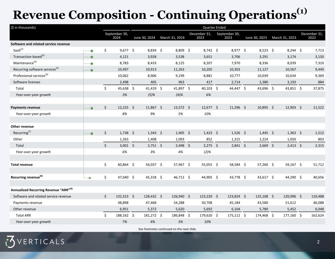 2 Revenue Composition - Continuing Operations(1) ($ in thousands) Quarter Ended September 30, 2024 June 30, 2024 March 31, 2024 December 31, 2023 September 30, 2023 June 30, 2023 March 31, 2023 December 31, 2022 Software and related service revenue SaaS(2) $ 9,677 $ 8,834 $ 8,809 $ 8,742 $ 8,977 $ 8,523 $ 8,244 $ 7,713 Transaction-based(3) 4,121 3,928 3,538 3,651 3,706 3,291 3,174 3,150 Maintenance(4) 8,783 8,433 8,125 8,207 7,970 8,336 8,039 7,310 Recurring software services(5) 10,497 10,913 11,263 10,205 10,303 11,127 10,567 9,449 Professional services(6) 10,062 8,906 9,199 8,881 10,777 10,039 10,634 9,369 Software licenses 2,498 405 963 417 2,714 2,380 3,193 884 Total $ 45,638 $ 41,419 $ 41,897 $ 40,103 $ 44,447 $ 43,696 $ 43,851 $ 37,875 Year-over-year growth 3 % (5) % (4) % 6 % Payments revenue $ 12,225 $ 11,867 $ 13,572 $ 12,677 $ 11,296 $ 10,895 $ 12,903 $ 11,522 Year-over-year growth 8 % 9 % 5 % 10 % Other revenue Recurring(7) $ 1,738 $ 1,343 $ 1,405 $ 1,423 $ 1,526 $ 1,445 $ 1,363 $ 1,512 Other 1,263 1,408 1,093 852 1,315 1,224 1,050 803 Total $ 3,001 $ 2,751 $ 2,498 $ 2,275 $ 2,841 $ 2,669 $ 2,413 $ 2,315 Year-over-year growth 6 % 3 % 4 % (2) % Total revenue $ 60,864 $ 56,037 $ 57,967 $ 55,055 $ 58,584 $ 57,260 $ 59,167 $ 51,712 Recurring revenue(8) $ 47,040 $ 45,318 $ 46,712 $ 44,905 $ 43,778 $ 43,617 $ 44,290 $ 40,656 Annualized Recurring Revenue “ARR”(9) Software and related service revenue $ 132,313 $ 128,432 $ 126,940 $ 123,220 $ 123,824 $ 125,108 $ 120,096 $ 110,488 Payments revenue 48,898 47,468 54,288 50,708 45,184 43,580 51,612 46,088 Other revenue 6,951 5,372 5,620 5,692 6,104 5,780 5,452 6,048 Total ARR $ 188,162 $ 181,272 $ 186,848 $ 179,620 $ 175,112 $ 174,468 $ 177,160 $ 162,624 Year-over-year growth 7 % 4 % 5 % 10 % See footnotes continued on the next slide.