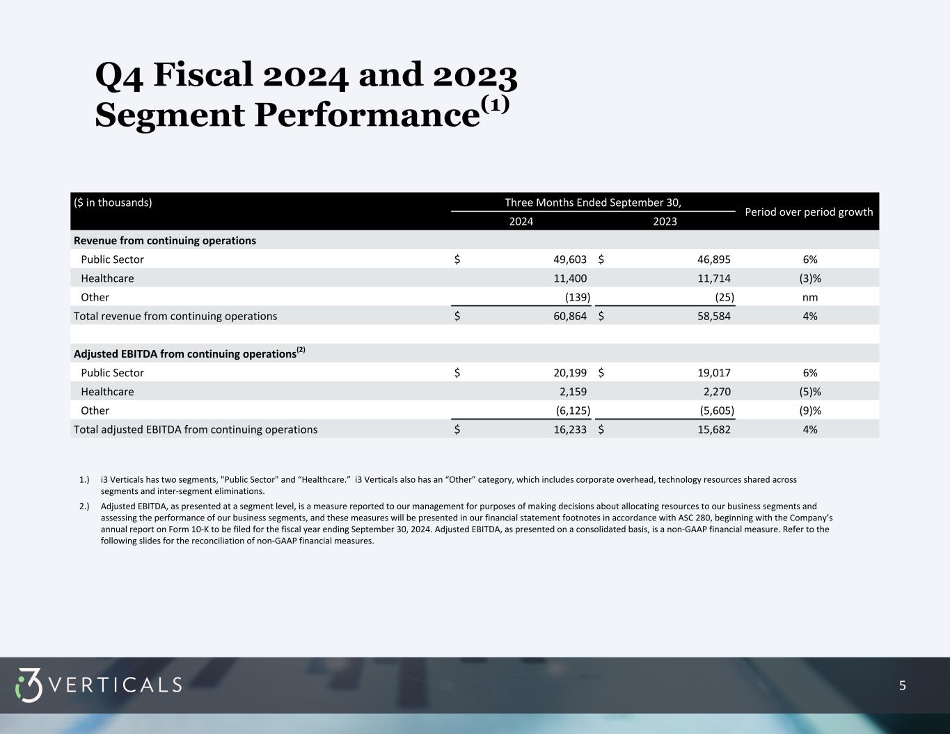 4 ($ in thousands) Year Ended September 30, 2024 Year Ended September 30, 2023 Public Sector Healthcare Other Total Public Sector Healthcare Other Total Income (loss) from operations(1) $ 49,712 $ 5,821 $ (48,679) $ 6,854 $ 41,987 $ 4,770 $ (50,326) $ (3,569) ($ in thousands) Three months ended September 30, 2024 Three months ended September 30, 2023 Public Sector Healthcare Other Total Public Sector Healthcare Other Total Income (loss) from operations(1) $ 14,268 $ 1,172 $ (11,886) $ 3,554 $ 12,182 $ 1,491 $ (12,418) $ 1,255 The following is our Income (loss) from continuing operations for the three and twelve months ended September 30, 2024 and 2023 calculated in accordance with GAAP. The presentation also includes references to non-GAAP financial measures presented by the Company. The Company believes that the non-GAAP financial measures presented by the Company provide useful information to investors in understanding and evaluating the Company's ongoing operating results. Accordingly, the Company includes such non-GAAP financial measures when reporting its financial results to shareholders and potential investors in order to provide them with an additional tool to evaluate the Company’s ongoing business operations. The Company believes that these non-GAAP financial measures are representative of comparative financial performance that reflects the economic substance of the Company’s current and ongoing business operations. Although these non-GAAP financial measures assist in measuring the Company's operating results and assessing its financial performance, they are not necessarily comparable to similarly titled measures of other companies due to potential inconsistencies in the method of calculation. The Company believes that the disclosure of these non-GAAP financial measures provides investors with important key financial performance indicators that are utilized by management to assess the Company's operating results, evaluate the business and make operational decisions on a prospective, going-forward basis. Hence, management provides disclosure of these non-GAAP financial measures to give shareholders and potential investors an opportunity to see the Company as viewed by management, to assess the Company with some of the same tools that management utilizes internally and to be able to compare such information with prior periods. The Company believes that disclosure of these non-GAAP financial measures provides investors with additional information to help them better understand its financial statements just as management utilizes these non-GAAP financial measures to better understand the business, manage budgets and allocate resources. Q4 Fiscal 2024 GAAP Measures 1.) As a result of the sale of our Merchant Services Business pursuant to the Purchase Agreement, the historical results of the Merchant Services Business have been reflected as discontinued operations in the results of operations included in this supplemental information, and i3 Verticals, Inc. no longer presents a Merchant Services segment. i3 Verticals, Inc. now operates within two updated segments, “Public Sector” and Healthcare”. i3 Verticals also has an “Other” category, which includes corporate overhead, technology resources shared across segments and inter-segment eliminations.